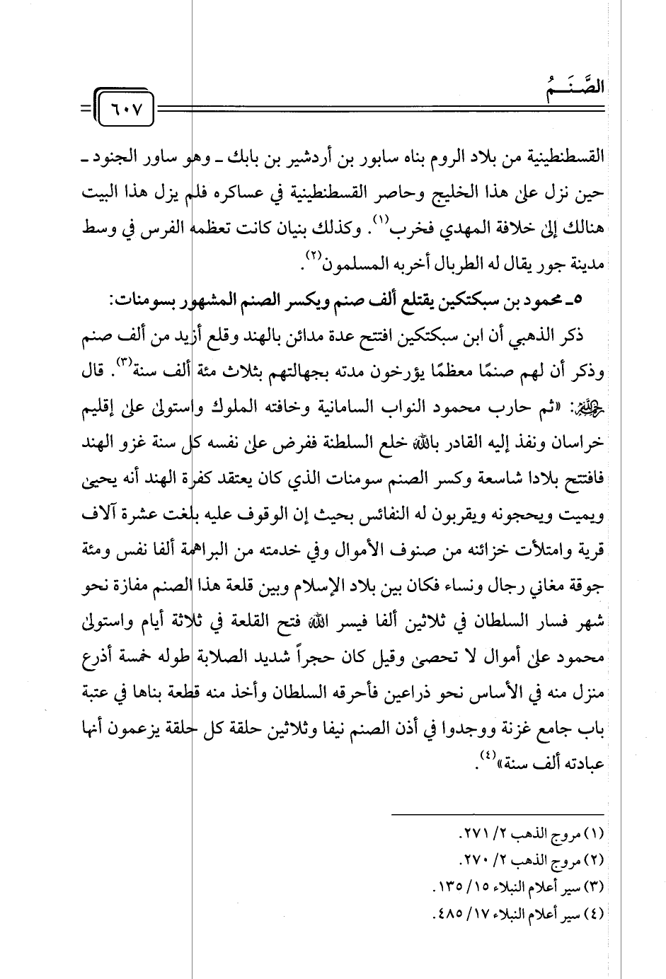 ذكر الذهبي أن ابن سبكتكين افتتح عدة مدائن بالهند وقلع أزيد من ألف صنم وذكر أن لهم صنمًا معظمًا يؤرخون مدته بجهالتهم بثلاث مئة ألف سنة (¬٣). قال - رحمه الله -: "ثم حارب محمود النواب السامانية وخافته الملوك واستولى على إقليم خراسان ونفذ إليه القادر بالله خلع السلطنة ففرض على نفسه كل سنة غزو الهند فافتتح بلادا شاسعة وكسر الصنم سومنات الذي كان يعتقد كفرة الهند أنه يحيى ويميت ويحجونه ويقربون له النفائس بحيث إن الوقوف عليه بلغت عشرة آلاف قرية وامتلأت خزائنه من صنوف الأموال وفي خدمته من البراهمة ألفا نفس ومئة جوقة مغاني رجال ونساء فكان بين بلاد الإسلام وبين قلعة هذا الصنم مفازة نحو شهر فسار السلطان في ثلاثين ألفا فيسر الله فتح القلعة في ثلاثة أيام واستولى محمود على أموال لا تحصى وقيل كان حجرًا شديد الصلابة طوله خمسة أذرع منزل منه في الأساس نحو ذراعين فأحرقه السلطان وأخذ منه قطعة بناها في عتبة باب جامع غزنة ووجدوا في أذن الصنم نيفا وثلاثين حلقة كل حلقة يزعمون أنها عبادته ألف سنة" (¬٤).