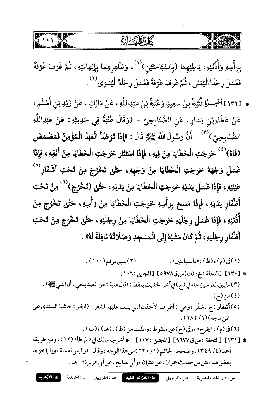 131- أَخبَرنا قُتَيبَةُ بنُ سَعِيدٍ، وَعُتْبَةُ بنُ عَبدِ اللهِ، عَن مَالِكٍ، عَن زَيْدِ بنِ أَسْلَمَ، عَن عَطَاءِ بنِ يَسَارٍ، عَنِ الصُّنَابِحِيّ، وَقَالَ عُتْبَةُ فِي حَدِيثِهِ: عَن عَبدِ اللهِ الصُّنَابِحِيِّ، أَنَّ رَسُولَ اللهِ صَلى الله عَليه وسَلم، قَالَ: إِذَا تَوَضَّأَ العَبدُ المُؤْمِنُ فَمَضْمَضَ فَاهُ خَرَجْتِ الخَطَايَا مِنْ فِيهِ، فَإِذَا اسْتَنْثَرَ خَرَجْتِ الخَطَايَا مِنْ أَنْفِهِ، فَإِذَا غَسَلَ وَجْهَهُ خَرَجْتِ الخَطَايَا مِنْ وَجْهِهِ حَتَّى تَخْرُجَ مِنْ تَحْتِ أَشْفَارِ عَيْنَيْهِ، فَإِذَا غَسَلَ يَدَيْهِ خَرَجْتِ الخَطَايَا مِنْ يَدَيْهِ حَتَّى تَخْرُجَ مِنْ تَحْتِ أَظْفَارِ يَدَيْهِ، فَإِذَا مَسَحَ بِرَأْسِهِ خَرَجْتِ الخَطَايَا مِنْ رَأْسِهِ حَتَّى تَخْرُجَ مِنْ أُذُنَيْهِ، فَإِذَا غَسَلَ رِجْلَيْهِ خَرَجْتِ الخَطَايَا مِنْ رِجْلَيْهِ حَتَّى تَخْرُجَ مِنْ تَحْتِ أَظْفَارِ رِجْلَيْهِ، ثُمَّ كَانَ مَشْيُهُ إِلَى المَسْجِدِ وَصَلاتُهُ نَافِلَةً لَهُ.
