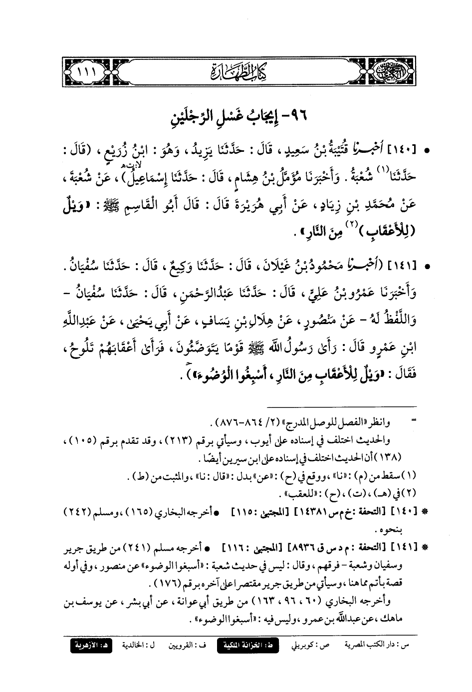141- أَخبَرَنا مَحْمُودُ بنُ غَيْلانَ، قال: حَدثنا وَكِيعٌ، حَدثنا سُفيان (ح) وَأَخبَرَنا عَمرُو بنُ عَليٍّ، قال: حَدثنا عَبدُ الرَّحمَنِ، قال: حَدثنا سُفيانُ، وَاللَّفْظُ لَهُ، عَن مَنصُورٍ، عَن هِلالِ بنِ يَسَافٍ، عَن أَبي يَحيَى، عَن عَبد اللهِ بن عَمْرٍو قَالَ: رَأَى رَسُولُ اللهِ صَلى الله عَليهِ وسَلم قَوْمًا يَتَوَضَّؤُونَ، فَرَأَى أَعْقَابَهُمْ تَلُوحُ فَقَالَ: وَيْلٌ لِلأَعْقَابِ مِنَ النَّارِ أَسْبِغُوا الوُضُوءَ (1).