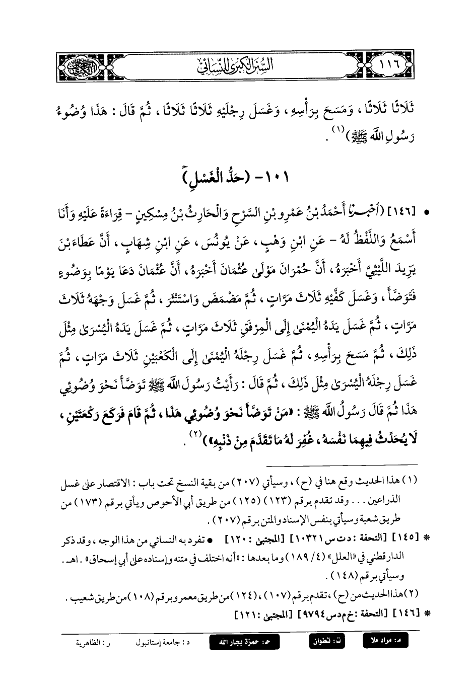146- أَخبَرَنَا أَحْمَدُ بنُ عَمْرِو بنِ السَّرْحِ، وَالحَارِثُ بنُ مِسْكِينٍ، قِرَاءَةً عَلَيْهِ وَأَنَا أَسْمَعُ، وَاللَّفْظُ لَهُ، عَنِ ابنِ وَهْبٍ، عَن يُونُسَ، عَنِ ابنِ شِهَابٍ، أَنَّ عَطَاءَ بْنَ يَزِيدَ اللَّيْثِيَّ، أَخبَرَهُ أَنَّ حُمْرَانَ مَوْلَى عُثْمَانَ أَخبَرَهُ ؛ أَنَّ عُثْمَانَ دَعَا يَوْمًا بِوَضُوءٍ فَتَوَضَّأَ وَغَسَلَ كَفَّيْهِ ثَلاثَ مَرَّاتٍ، ثُمَّ مَضْمَضَ وَاسْتَنْثَرَ، ثُمَّ غَسَلَ وَجْهَهُ ثَلاثَ مَرَّاتٍ، ثُمَّ غَسَلَ يَدَهُ اليُمْنَى إِلَى المِرْفَقِ ثَلاثَ مَرَّاتٍ، ثُمَّ غَسَلَ يَدَهُ اليُسْرَى مِثْلَ ذَلِكَ، ثُمَّ مَسَحَ بِرَأْسِهِ، ثُمَّ غَسَلَ رِجْلَهُ اليُمْنَى إِلَى الكَعْبَيْنِ ثَلاثَ مَرَّاتٍ، ثُمَّ غَسَلَ رِجْلَهُ اليُسْرَى مِثْلَ ذَلِكَ، ثُمَّ قَالَ: رَأَيْتُ رَسُولَ اللهِ صَلى الله عَليهِ وسَلم تَوَضَّأَ نَحْوَ وُضُوئِي هَذَا، ثُمَّ قَالَ رَسُولُ اللهِ صَلى الله عَليهِ وسَلم: مَنْ تَوَضَّأَ نَحْوَ وُضُوئِي هَذَا ثُمَّ قَامَ فَرَكَعَ رَكْعَتَيْنِ لا يُحَدِّثُ فِيهِمَا نَفْسَهُ غُفِرَ لَهُ مَا تَقَدَّمَ مِنْ ذَنْبِهِ (1).