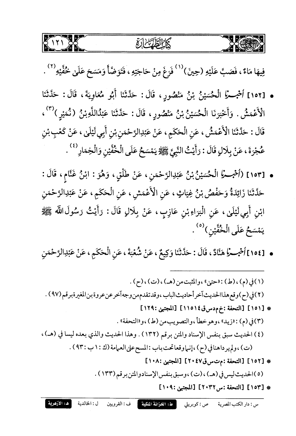 153- أَخبَرنا الحُسَيْنُ بنُ عَبدِ الرَّحمَنِ، عَن طَلْقِ، وَهُوَ ابنُ غَنَّامٍ، قَالَ: حَدثنا زَائِدَةُ، وَحَفْصُ بنُ غِيَاثٍ، عَنِ الأَعْمَشِ، عَنِ الحَكَمِ، عَن عَبدِ الرَّحمَنِ بنِ أَبي لَيْلَى، عَنِ البَرَاءِ بنِ عَازِبٍ، عَن بِلالٍ قَالَ: رَأَيْتُ رَسُولَ اللهِ صَلى الله عَليه وسَلم يَمْسَحُ عَلَى الخُفَّيْنِ.