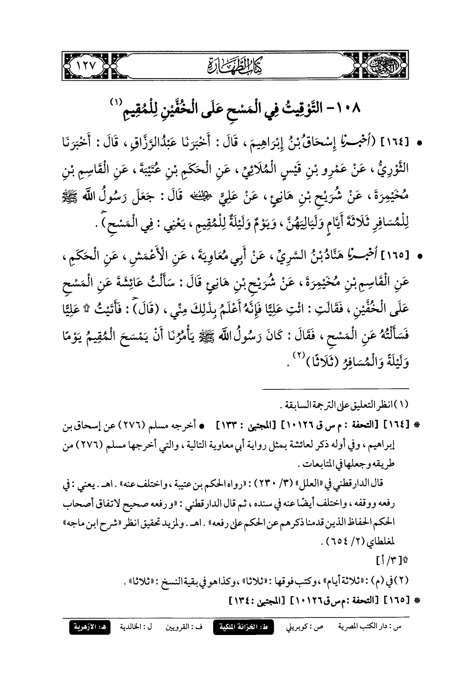 164- أَخبَرَنا إِسحَاقُ بنُ إِبرَاهِيمَ، قَالَ: أَخبَرَنا عَبدُ الرَّزَّاقِ، قَالَ: أَخبَرَنا الثَّوْرِيُّ، عَن عَمْرِو بنِ قَيسٍ المُلائِيِّ، عَنِ الحَكَمِ بنِ عُتَيْبَةَ، عَنِ القَاسِمِ بنِ مُخَيْمِرَةَ، عَن شُرَيْحِ بنِ هَانِئٍ، عَن عَليٍّ رَضِيَ اللهُ عَنهُ قَالَ: جَعَلَ رَسُولُ اللهِ صَلى الله عَليهِ وسَلم لِلْمُسَافِرِ ثَلاثَةَ أَيَّامٍ وَلَيَالِيَهُنَّ، وَيَوْمًا وَلَيْلَةً لِلْمُقِيمِ، يَعْنِي فِي المَسْحِ (1).