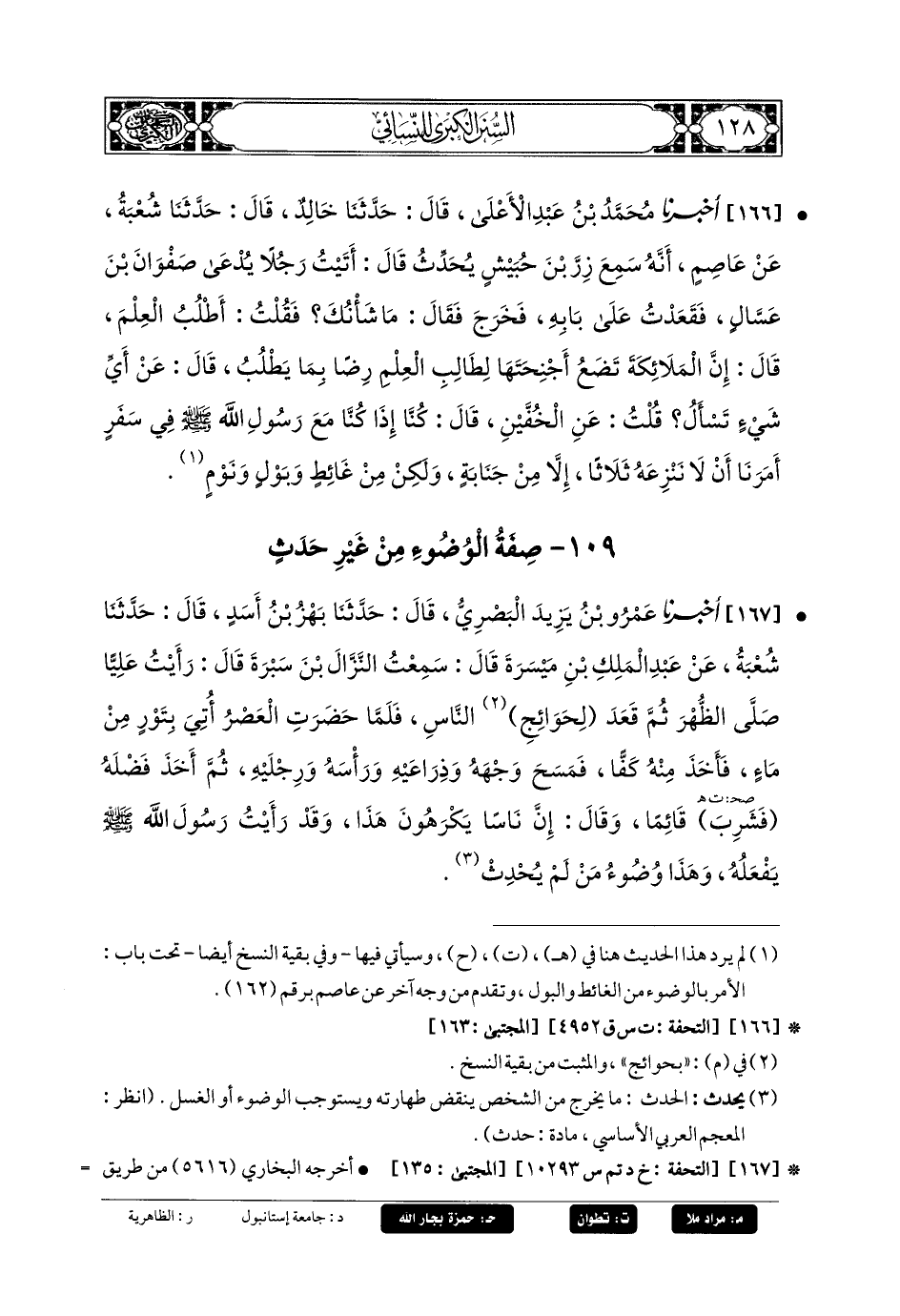 166- أَخبَرنا مُحَمدُ بنُ عَبدِ الأَعْلَى، قَالَ: حَدثنا خَالِدٌ، قَالَ: أَخبَرنا شُعبَةُ، عَن عَاصِمٍ، أَنَّهُ سَمِعَ زِرَّ بْنَ حُبَيْشٍ يُحَدِّثُ، قَالَ: أَتَيْتُ رَجُلاً يُدْعَى صَفْوَانَ بْنَ عَسَّالٍ فَقَعَدْتُ عَلَى بَابِهِ فَخَرَجَ، فَقَالَ: مَا شَأْنُكَ؟ فَقُلْتُ: أَطْلُبُ العِلْمَ، قَالَ: إِنَّ المَلائِكَةَ تَضَعُ أَجْنِحَتَهَا لِطَالِبِ العِلْمِ رِضًى بِمَا يَطْلُبُ، قَالَ: عَن أَيِّ شَيْءٍ تَسْأَلُ؟ قُلْتُ: عَنِ الخُفَّيْنِ، قَالَ: كُنَّا إِذَا كُنَّا مَعَ رَسُولِ اللهِ صَلى الله عَليه وسَلم فِي سَفَرٍ أَمَرَنَا أَنْ لا نَنْزِعَهُ ثَلاثًا إِلاَّ مِنْ جَنَابَةٍ، وَلَكِنْ مِنْ غَائِطٍ وَبَوْلٍ وَنَوْمٍ.
