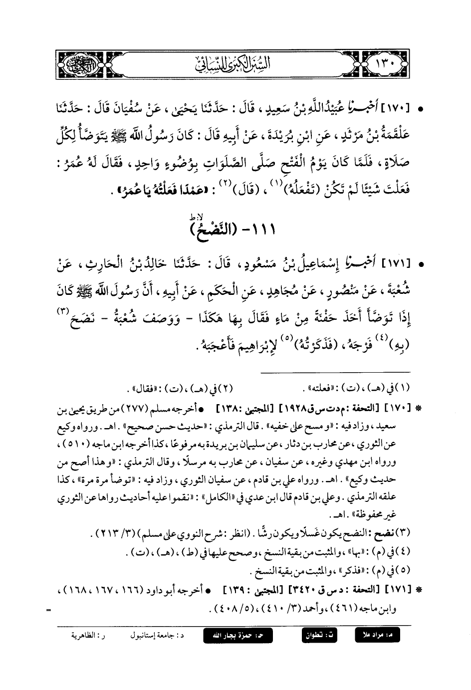 171- أَخبَرنا إِسمَاعِيلُ بنُ مَسْعُودٍ، قَالَ: حَدثنا خَالِدُ بنُ الحَارِثِ، عَن شُعبَةَ، عَن مَنصُورٍ، عَن مُجَاهِدٍ، عَنِ الحَكَمِ، عَن أَبيهِ، أَنَّ رَسُولَ اللهِ صَلى الله عَليه وسَلم كَانَ إِذَا تَوَضَّأَ أَخَذَ حَفْنَةً مِنْ مَاءٍ، فَقَالَ بِهَا هَكَذَا وَوَصَفَ شُعبَةُ نَضَحَ بِهِ فَرْجَهُ.