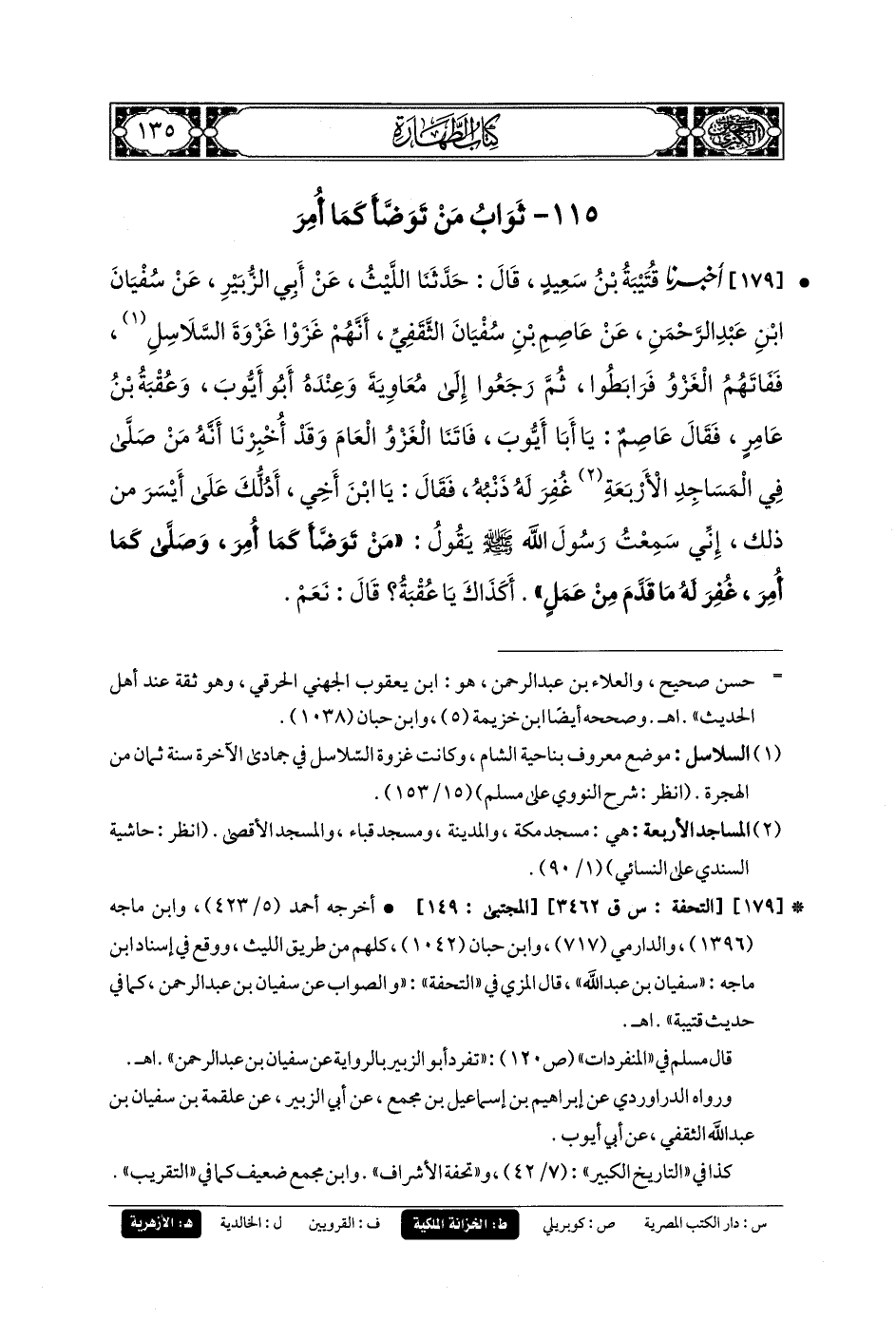 179- أَخبَرنا قُتَيبَةُ بنُ سَعِيدٍ، قَالَ: حَدثنا اللَّيْثُ، عَن أَبي الزُّبَيْرِ، عَن سُفيانَ بنِ عَبدِ الرَّحمَنِ، عَن عَاصِمِ بنِ سُفيانَ الثَّقَفِيُّ، أَنَّهُمْ غَزَوْا غَزْوَةَ السَّلاسِلِ فَفَاتَهُمُ الغَزْوُ فَرَابَطُوا، ثُمَّ رَجَعُوا إِلَى مُعَاوِيَةَ وَعِنْدَهُ أَبو أَيوبَ وَعُقْبَةُ بنُ عَامِرٍ، فَقَالَ عَاصِمٌ: يَا أَبَا أَيوبَ فَاتَنَا الغَزْوُ العَامَ وَقَدْ أُخْبِرْنَا أَنَّهُ مَنْ صَلَّى فِي المَسَاجِدِ الأَرْبَعَةِ غُفِرَ لَهُ ذَنْبُهُ، فَقَالَ: يَا ابنَ أَخِي، أَدُلُّكَ عَلَى أَيْسَرَ مِنْ ذَلِكَ: إِنِّي سَمِعْتُ رَسُولَ اللهِ صَلى الله عَليه وسَلم، يَقُولُ: مَنْ تَوَضَّأَ كَمَا أُمِرَ، وَصَلَّى كَمَا أُمِرَ غُفِرَ لَهُ مَا قَدَّمَ مِنْ عَمَلٍ أَكَذَاكَ يَا عُقْبَةُ؟ قَالَ: نَعَمْ.