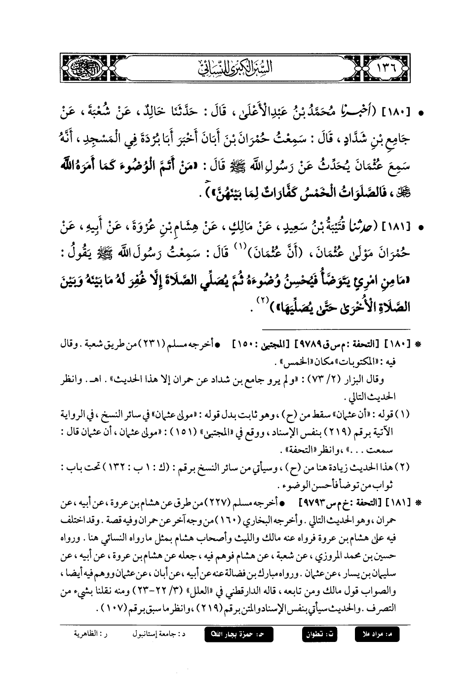 180- أَخبَرَنا مُحَمد بن عَبدِ الأَعلَى، قال: حَدثنا خَالِدٌ، عَن شُعبَةَ، عَن جَامِعِ بنِ شَدَّادٍ، قَالَ: سَمِعْتُ حُمْرَانَ بْنَ أَبَانَ أَخبَرَ أَبَا بُرْدَةَ فِي المَسْجِدِ أَنَّهُ سَمِعَ عُثْمَانَ يُحَدِّثُ عَن رَسُولِ اللهِ صَلى الله عَليهِ وسَلم قَالَ: مَنْ أَتَمَّ الوُضُوءَ كَمَا أَمَرَهُ اللهُ عَزَّ وَجَلَّ، فَالصَّلَوَاتُ الخَمْسُ كَفَّارَاتٌ لِمَا بَيْنَهُنَّ (1).