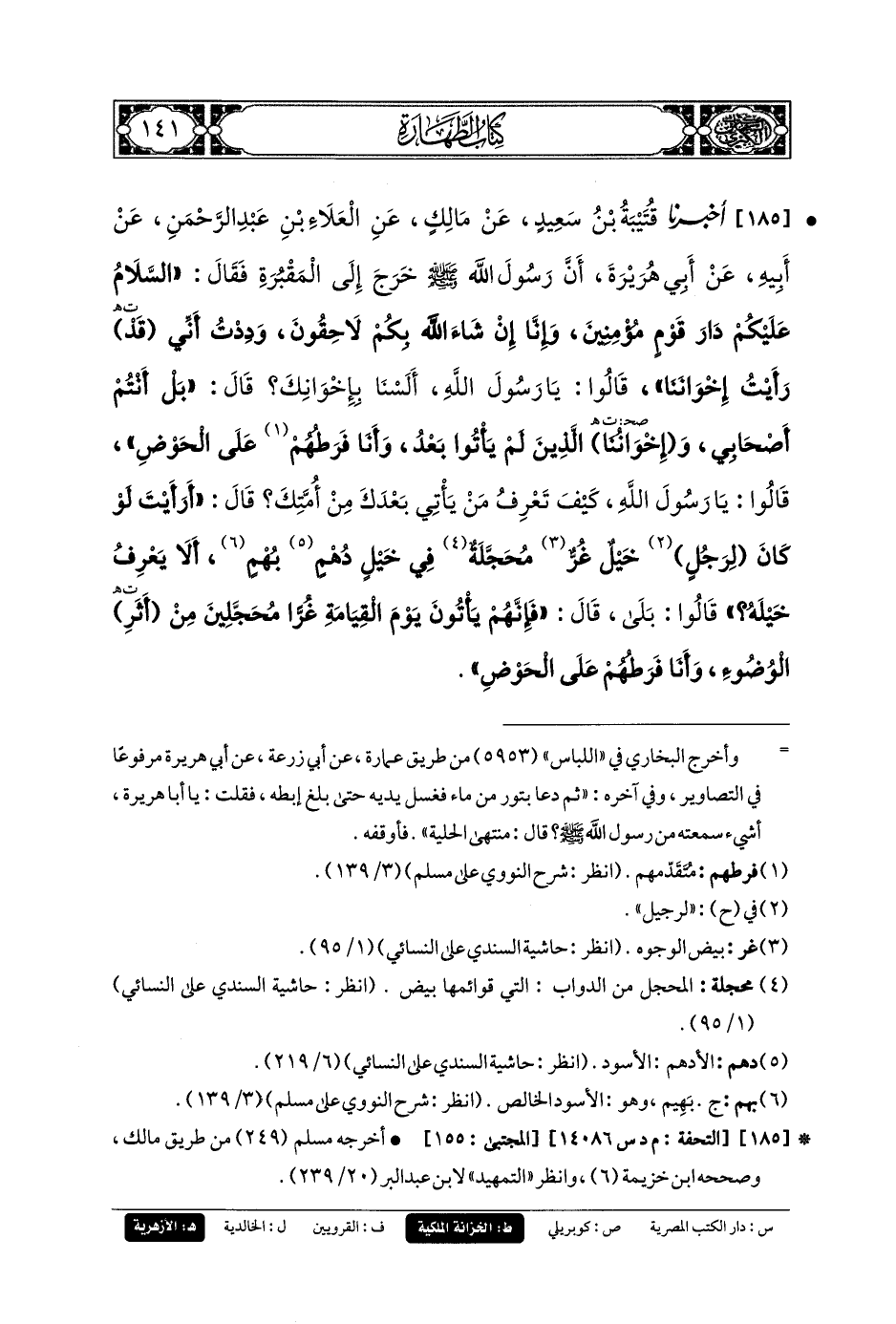 185- أَخبَرنا قُتَيبَةُ بنُ سَعِيدٍ، عَن مَالِكٍ، عَنِ العَلاءِ بنِ عَبدِ الرَّحمَنِ، عَن أَبيهِ، عَن أَبي هُرَيرَةَ، أَنَّ رَسُولَ اللهِ صَلى الله عَليه وسَلم خَرَجَ إِلَى المَقْبُرَةِ، فَقَالَ: السَّلامُ عَلَيْكُمْ دَارَ قَوْمٍ مُؤْمِنِينَ وَإِنَّا إِنْ شَاءَ اللهُ بِكُمْ لاحِقُونَ، وَدِدْتُ أَنِّي قَدْ رَأَيْتُ إِخْوَانَنَا، قَالُوا يَا رَسُولَ اللهِ أَلَسْنَا بِإِخْوَانِكَ؟ قَالَ: بَلْ أَنْتُمْ أَصْحَابِي وَإِخْوَانُنَا الَّذِينَ لَمْ يَأْتُوا بَعْدُ، وَأَنَا فَرَطُهُمْ عَلَى الحَوْضِ، قَالُوا: يَا رَسُولَ اللهِ كَيْفَ تَعْرِفُ مَنْ يَأْتِي بَعْدَكَ مِنْ أُمَّتِكَ؟ قَالَ: أَرَأَيْتَ لَوْ كَانَ لِرَجُلٍ خَيْلٌ غُرٌّ مُحَجَّلَةٌ فِي خَيْلٍ دُهْمٍ بُهْمٍ أَلا يَعْرِفُ خَيْلَهُ؟ قَالُوا: بَلَى، قَالَ: فَإِنَّهُمْ يَأْتُونَ يَوْمَ القِيَامَةِ غُرًّا مُحَجَّلِينَ مِنْ أَثَرِ الوُضُوءِ، وَأنا فَرَطُهُمْ عَلَى الحَوْضِ.