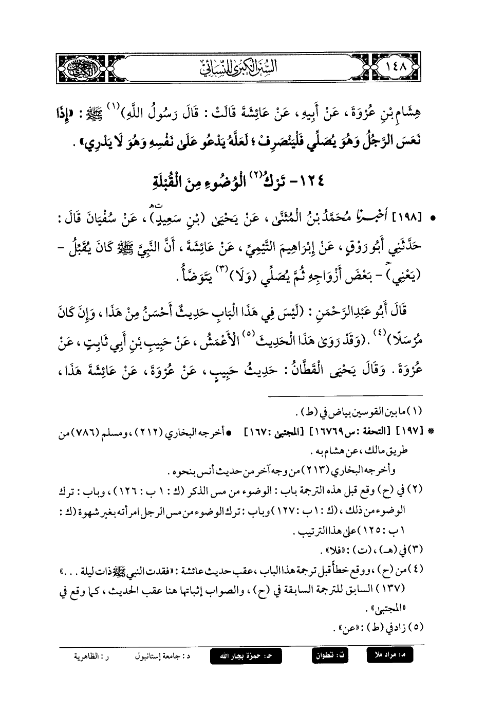 198- أَخبَرنا مُحَمدُ بنُ المُثَنَّى، عَن يَحيَى بنُ سَعِيدٍ، عَن سُفيانَ، قَالَ: حَدَّثني أَبو رَوْقٍ، عَن إِبرَاهِيمَ التَّيْمِيِّ، عَن عَائِشَةَ، أَنَّ النَّبيَّ صَلى الله عَليه وسَلم كَانَ يُقَبِّلُ يَعْنِي بَعْضَ أَزْوَاجِهِ، ثُمَّ يُصَلِّي وَلا يَتَوَضَّأُ.