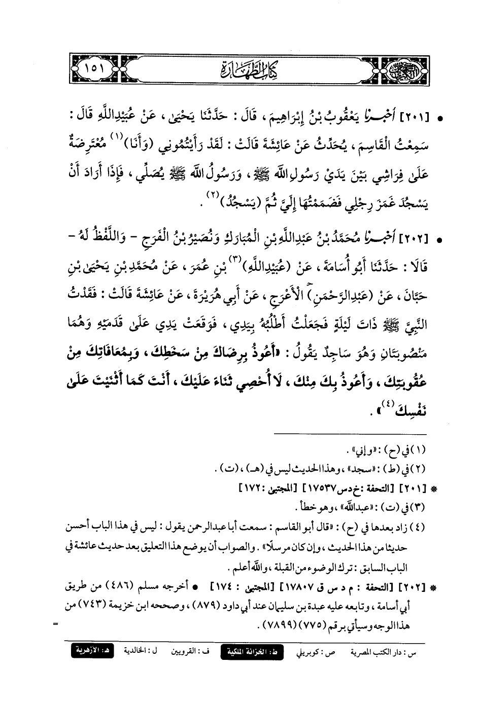 202- أَخبَرنا مُحَمدُ بنُ عَبدِ اللهِ بنِ المُبَارَكِ، وَنُصَيْرُ بنُ الفَرَجِ، وَاللَّفْظُ لَهُ، قَالا: حَدثنا أَبو أُسَامَةَ، عَن عُبَيدِ اللهِ بنِ عُمَرَ، عَن مُحَمدِ بنِ يَحيَى بنِ حَبَّانَ، عَنِ عَبدِ الرَّحمَنِ الأَعْرَجِ، عَن أَبي هُرَيرَةَ، عَن عَائِشَةَ، قَالَتْ: فَقَدْتُ النَّبيَّ صَلى الله عَليه وسَلم ذَاتَ لَيْلَةٍ، فَجَعَلْتُ أَطْلُبُهُ بِيَدِي فَوَقَعَتْ يَدِي عَلَى قَدَمَيْهِ وَهُمَا مَنصُوبَتَانِ، وَهُوَ سَاجِدٌ، يَقُولُ: أَعُوذُ بِرِضَاكَ مِنْ سَخَطِكَ وَبِمُعَافَاتِكَ مِنْ عُقُوبَتِكَ، وَأَعُوذُ بِكَ مِنْكَ، لا أُحْصِي ثَنَاءً عَلَيْكَ أَنْتَ كَمَا أَثْنَيْتَ عَلَى نَفْسِكَ.