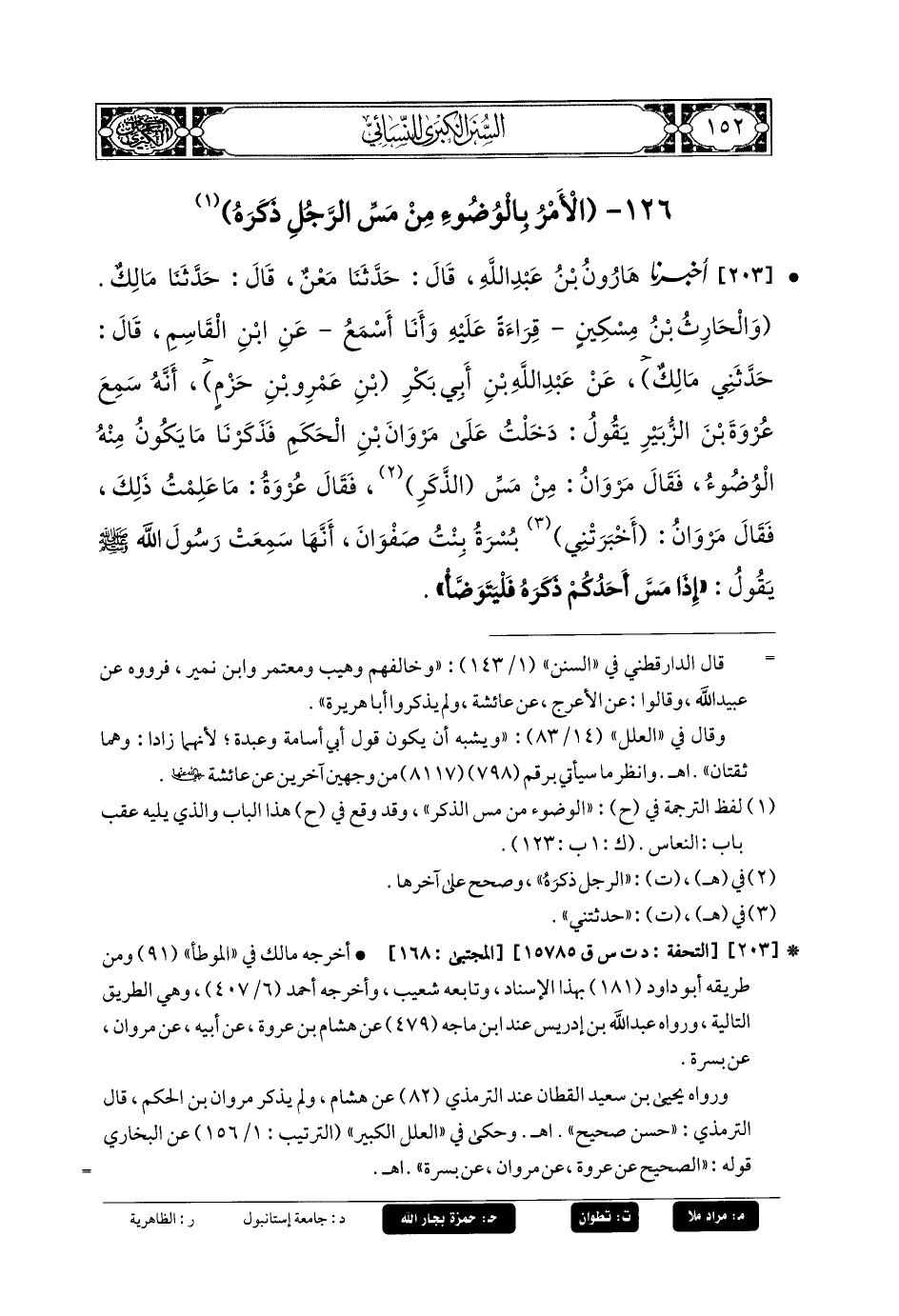 203- أَخبَرنا هَارُونُ بنُ عَبدِ اللهِ، قَالَ: حَدثنا مَعْنٌ، قَالَ: حَدثنا مَالِكٌ، (وَالحَارِثُ بنُ مِسْكِينٍ، قِرَاءَةً عَلَيْهِ وَأَنَا أَسْمَعُ، عَنِ ابنِ القَاسِمِ قَالَ: حَدَّثنِي مَالِكٌ) (1)، عَن عَبد اللهِ بن أَبي بَكْرِ بنِ مُحَمدِ بنِ عَمْرِو بنِ حَزْمٍ، أَنَّهُ سَمِعَ عُرْوَةَ بْنَ الزُّبَيْرِ، يَقُولُ: دَخَلْتُ عَلَى مَرْوَانَ بنِ الحَكَمِ فَذَكَرْنَا مَا يَكُونُ مِنْهُ الوُضُوءُ، فَقَالَ مَرْوَانُ: مِنْ مَسِّ الذَكَرِ، فَقَالَ عُرْوَةُ: مَا عَلِمْتُ ذَلِكَ، فَقَالَ مَرْوَانُ: أَخبَرَتْنِي بُسْرَةُ بِنْتُ صَفْوَانَ أَنَّهَا سَمِعَتْ رَسُولَ اللهِ صَلى الله عَليه وسَلم، يَقُولُ: إِذَا مَسَّ أَحَدُكُمْ ذَكَرَهُ فَلْيَتَوَضَّأْ.