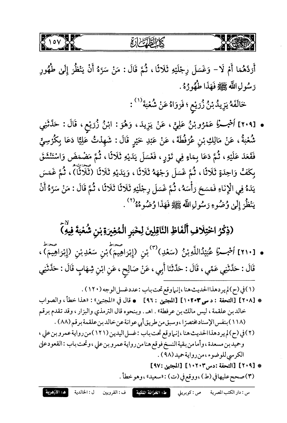 209- أَخبَرنا عَمرُو بنُ عَليٍّ، عَن يَزِيدَ، وَهُوَ ابنُ زُرَيْعٍ، قَالَ: حَدَّثني شُعبَةُ، عَن مَالِكِ بنِ عُرْفُطَةَ، عَن عَبدِ خَيْرٍ، قَالَ: شَهِدْتُ عَليًّا دَعَا بِكُرْسِيٍّ فَقَعَدَ عَلَيْهِ، ثُمَّ دَعَا بِمَاءٍ فِي تَوْرٍ، فَغَسَلَ يَدَيْهِ ثَلاثًا، ثُمَّ مَضْمَضَ وَاسْتَنْشَقَ بِكَفٍّ وَاحِدَةٍ ثَلاثًا، ثُمَّ غَسَلَ وَجْهَهُ ثَلاثًا، وَيَدَيْهِ ثَلاثًا ثَلاثًا، ثُمَّ غَمَسَ يَدَهُ فِي الإِنَاءِ فَمَسَحَ رَأْسَهُ، ثُمَّ غَسَلَ رِجْلَيْهِ ثَلاثًا ثَلاثًا، ثُمَّ قَالَ: مَنْ سَرَّهُ أَنْ يَنْظُرَ إِلَى وُضُوءِ رَسُولِ اللهِ صَلى الله عَليه وسَلم فَهَذَا وُضُوءُهُ.