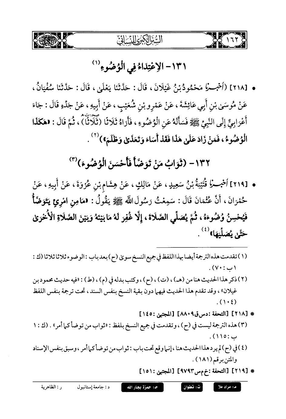 218- أَخبَرنا مَحْمُودُ بنُ غَيْلانَ، قَالَ: حَدثنا يَعْلَى، قَالَ: حَدثنا سُفيانُ، عَن مُوسَى بنِ أَبي عَائِشَةَ، عَن عَمْرِو بنِ شُعَيبٍ، عَن أَبيهِ، عَن جَدِّهِ، قَالَ: جَاءَ أَعْرَابِيٌّ إِلَى النَّبيِّ صَلى الله عَليه وسَلم فَسَأَلَهُ عَنِ الوُضُوءِ فَأَرَاهُ ثَلاثًا ثَلاثًا، ثُمَّ قَالَ: هَكَذَا الوُضُوءُ فَمَنْ زَادَ عَلَى هَذَا فَقَدْ أَسَاءَ وَتَعَدَّى وَظَلَمَ (1).