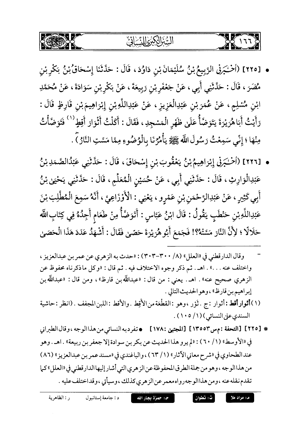 225- أَخبَرَني الرَّبِيعُ بنُ سُلَيمَانَ بنِ دَاوُدَ، قال: حَدثنا إِسحَاقُ بنِ بَكْرِ بنِ مُضَرَ، قَالَ: حَدَّثني أَبي، عَن جَعفَرِ بنِ رَبِيعَةَ، عَن بَكْرِ بنِ سَوَادَةَ، عَن مُحَمدِ بنِ مُسْلِمٍ، عَن عُمَرَ بنِ عَبدِ العَزِيزِ، عَن عَبد اللهِ بن إِبرَاهِيمَ بنِ قَارِظٍ قَالَ: رَأَيْتُ أَبَا هُرَيرَةَ يَتَوَضَّأُ عَلَى ظَهْرِ المَسْجِدِ، فَقَالَ: أَكَلْتُ أَثْوَارَ أَقِطٍ فَتَوَضَّأْتُ مِنْهَا، إِنِّي سَمِعْتُ رَسُولَ اللهِ صَلى الله عَليهِ وسَلم يَأْمُرُنَا بِالوُضُوءِ مِمَّا مَسَّتِ النَّارُ (1).