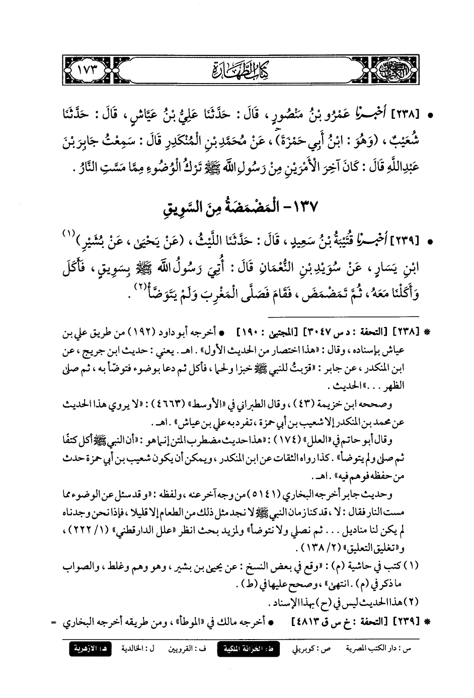 239- أَخبَرنا قُتَيبَةُ بنُ سَعِيدٍ، قَالَ: حَدثنا اللَّيْثُ، عَن يَحيَى، عَن بُشَيْرِ بنِ يَسَارٍ، عَن سُوَيْدِ بنِ النُّعْمَانَ، قَالَ: أُتِيَ رَسُولُ اللهِ صَلى الله عَليه وسَلم بِسَوِيقٍ فَأَكَلَ وَأَكَلْنَا مَعَهُ، ثُمَّ تَمَضْمَضَ فَقَامَ فَصَلَّى المَغْرِبَ، وَلَمْ يَتَوَضَّأْ.