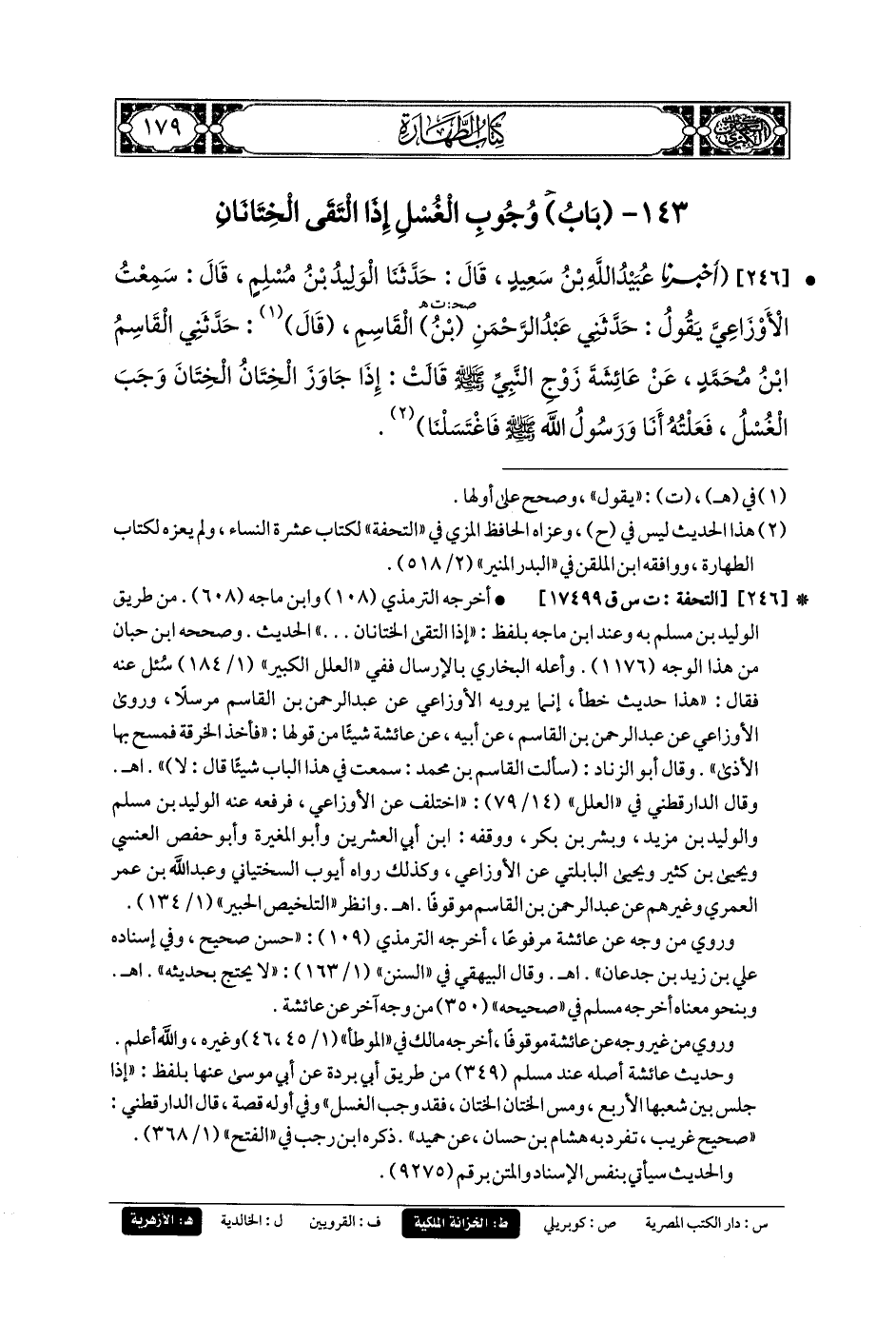 246- أَخبَرنا عُبَيدُ اللهِ بنُ سَعِيدٍ، قَالَ: حَدثنا الوَلِيدُ بنُ مُسْلِمٍ، قَالَ: سَمِعْتُ الأَوْزَاعِيَّ يَقُولُ: حَدَّثني عَبدُ الرَّحمَنِ بنُ القَاسِمِ، قَالَ: حَدَّثني القَاسِمُ بنُ مُحَمدٍ، عَن عَائِشَةَ، زَوْجِ النَّبيِّ صَلى الله عَليه وسَلم، قَالَتْ: إِذَا جَاوَزَ الخِتَانُ الخِتَانَ وَجَبَ الغُسْلُ، فَعَلْتُهُ أَنَا وَرَسُولُ اللهِ صَلى الله عَليه وسَلم فَاغْتَسَلْنَا.