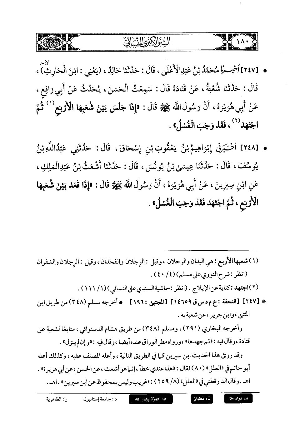 247- أَخبَرنا مُحَمدُ بنُ عَبدِ الأَعْلَى، قَالَ: حَدثنا خَالِدٌ، يَعْنِي ابنَ الحَارِثِ، قَالَ: حَدثنا شُعبَةُ، عَن قَتَادَةَ، قَالَ: سَمِعْتُ الحَسَنَ يُحَدِّثُ عَن أَبي رَافِعٍ، عَن أَبي هُرَيرَةَ، أَنَّ رَسُولَ اللهِ صَلى الله عَليه وسَلم، قَالَ: إِذَا جَلَسَ بَيْنَ شُعَبِهَا الأَرْبَعِ، ثُمَّ اجْتَهَدَ فَقَدْ وَجَبَ الغُسْلُ.