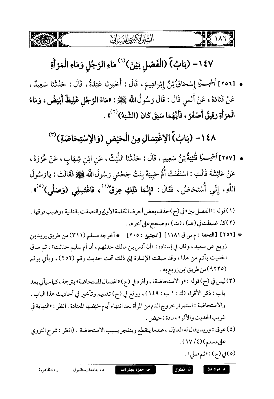 257- أَخبَرنا قُتَيبَةُ بنُ سَعِيدٍ، قَالَ: حَدثنا اللَّيْثُ، عَنِ ابنِ شِهَابٍ، عَن عُرْوَةَ، عَن عَائِشَةَ، قَالَتْ: اسْتَفْتَتْ أُمُّ حَبِيبَةَ بِنْتِ جَحْشٍ رَسُولَ اللهِ صَلى الله عَليه وسَلم، فَقَالَتْ: يَا رَسُولَ اللهِ إِنِّي أُسْتَحَاضُ، فَقَالَ: إِنَّمَا ذَلِكَ عِرْقٌ، فَاغْتَسِلِي وَصَلِّي فَكَانَتْ تَغْتَسِلُ عِنْدَ كُلِّ صَلاةٍ.