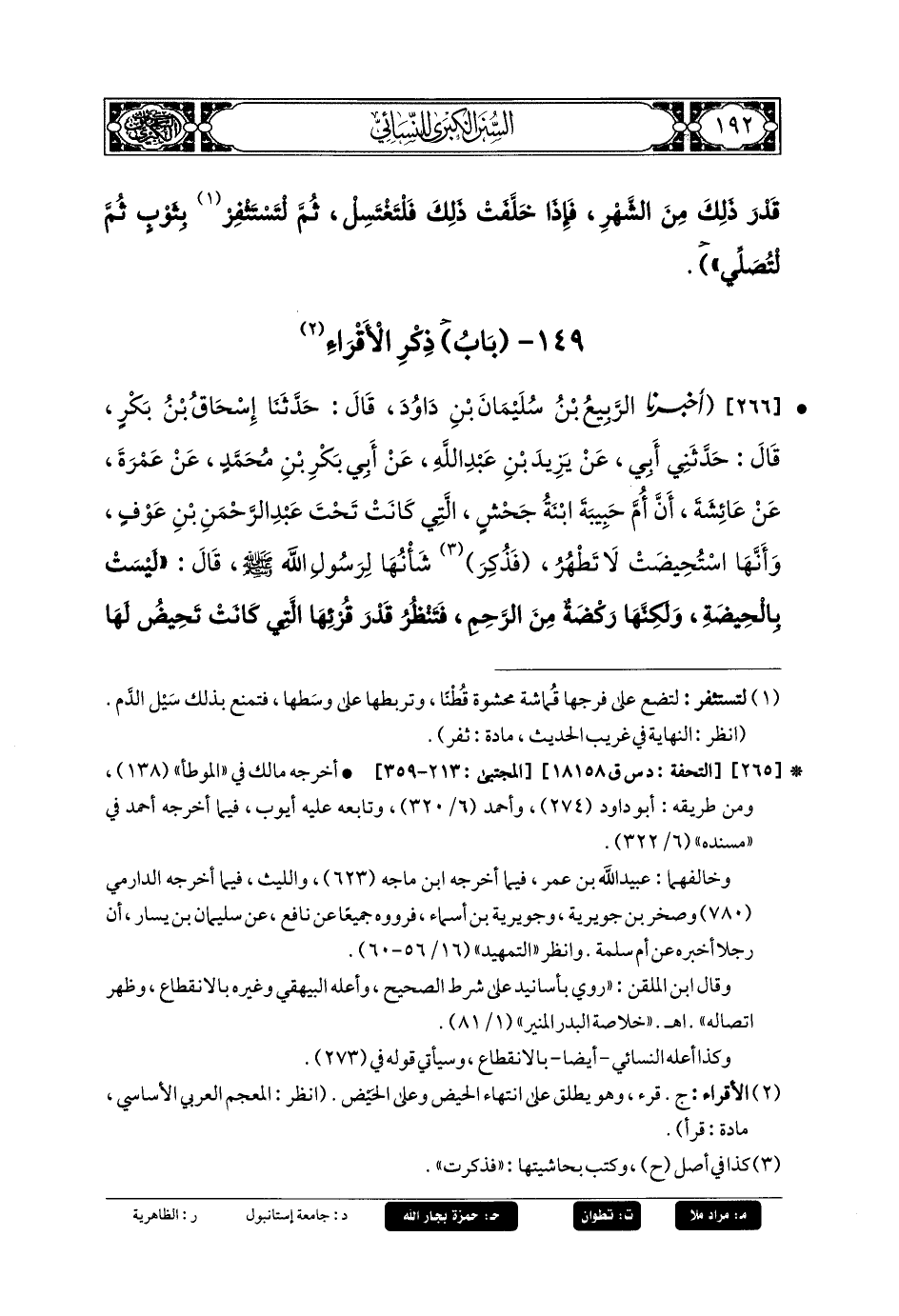 266- أَخبَرَنا الرَّبِيعُ بنُ سُلَيمَانَ بنِ دَاوُدَ، قال: حَدثنا إِسحَاقُ بنُ بَكْرٍ، قَالَ: حَدَّثني أَبي، عَن يَزِيدَ بنِ عَبدِ اللهِ، عَن أَبي بَكْرِ بنِ مُحَمدٍ، عَن عَمْرَةَ، عَن عَائِشَةَ؛ أَنَّ أُمَّ حَبِيبَةَ ابنَةُ جَحْشٍ الَّتِي كَانَتْ تَحْتَ عَبدِ الرَّحمَنِ بنِ عَوْفٍ، وَأَنَّهَا اسْتُحِيضَتْ لا تَطْهُرْ، فَذُكِرَ شَأْنُهَا لِرَسُولِ اللهِ صَلى الله عَليهِ وسَلم، قَالَ: لَيْسَتْ بِالحَيْضَةِ، وَلَكِنَّهَا رَكْضَةٌ مِنَ الرَّحِمِ، فَتَنْظُرْ قَدْرَ قُرْئِهَا الَّتِي كَانَتْ تَحِيضُ لَهَا فَتَتْرُكُ الصَّلاةَ، ثُمَّ تَنْظُرْ مَا بَعْدَ ذَلِكَ فَلْتَغْتَسِلْ عِنْدَ كُلِّ صَلاةٍ (1).