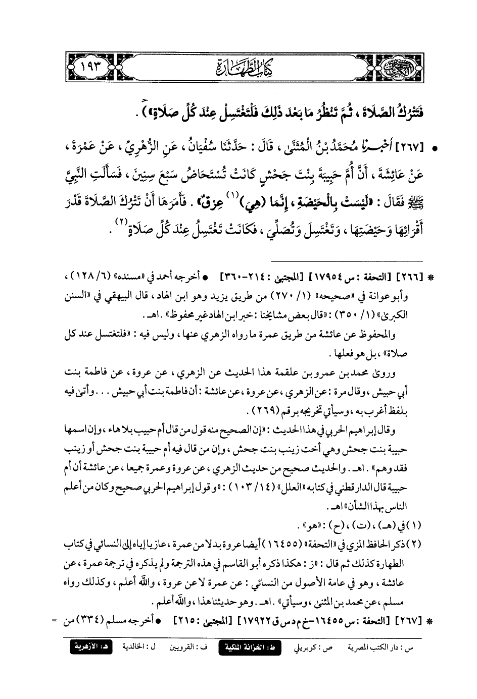 267- أَخبَرنا مُحَمدُ بنُ المُثَنَّى، قَالَ: حَدثنا سُفيانُ، عَنِ الزُّهْرِيِّ، عَن عَمْرَةَ، عَن عَائِشَةَ، أَنَّ أُمَّ حَبِيبَةَ بِنْتَ جَحْشٍ، كَانَتْ تُسْتَحَاضُ سَبْعَ سِنِينَ، فَسَأَلْتِ النَّبيَّ صَلى الله عَليه وسَلم؟ فَقَالَ: لَيْسَتْ بِالحَيْضَةِ، إِنَّمَا هِيَ عِرْقٌ، فَأَمَرَهَا أَنْ تَتْرُكَ الصَّلاةَ قَدْرَ أَقْرَائِهَا وَحَيْضَتِهَا وَتَغْتَسِلَ وَتُصَلِّي، فَكَانَتْ تَغْتَسِلُ عِنْدَ كُلِّ صَلاةٍ.