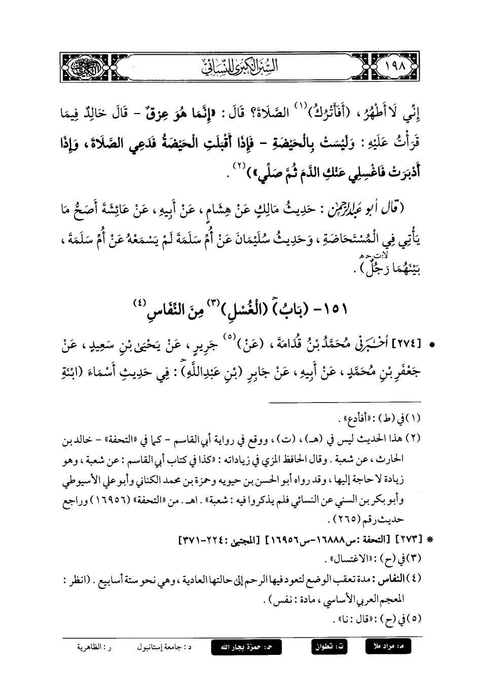 274- أَخبَرني مُحَمدُ بنُ قُدَامَةَ، عَن جَرِيرٍ، عَن يَحيَى بنِ سَعِيدٍ، عَن جَعفَرِ بنِ مُحَمدٍ، عَن أَبيهِ، عَن جَابِرِ بنِ عَبدِ اللهِ، فِي حَدِيثِ أَسْمَاءَ ابنَةِ عُمَيْسٍ حِينَ نُفِسْتِ بِذِي الحُلَيْفَةِ، أَنَّ رَسُولَ اللهِ صَلى الله عَليه وسَلم قَالَ لأَبي بَكْرٍ الصِّدِّيقِ: مُرْهَا أَنْ تَغْتَسِلَ وَتُهِلَّ.