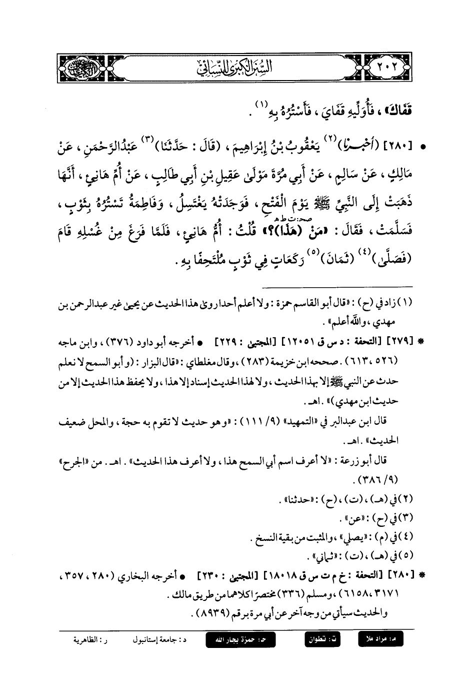 280- أَخبَرنا يَعقُوبُ بنُ إِبرَاهِيمَ، قَالَ: حَدثنا عَبدُ الرَّحمَنِ، عَن مَالِكٍ، عَن سَالِمٍ، عَن أَبي مُرَّةَ، مَوْلَى عَقِيلِ بنِ أَبي طَالِبٍ، عَن أُمِّ هَانِئٍ، أَنَّهَا ذَهَبَتْ إِلَى النَّبيِّ صَلى الله عَليه وسَلم يَوْمَ الفَتْحِ: فَوَجَدْتُهُ يَغْتَسِلُ وَفَاطِمَةُ تَسْتُرُهُ بِثَوْبٍ، فَسَلَّمْتُ، فَقَالَ: مَنْ هَذَا؟ قُلْتُ: أُمُّ هَانِئٍ، فَلَمَّا فَرَغَ مِنْ غُسْلِهِ، قَامَ فَصَلَّى ثَمَانِيَ رَكَعَاتٍ فِي ثَوْبٍ مُلْتَحِفًا بِهِ.