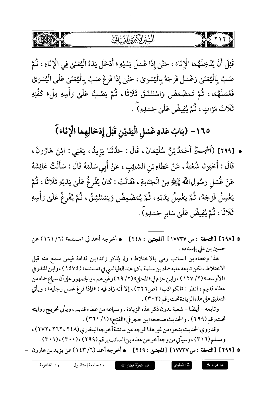 299- أَخبَرَنا أَحْمَدُ بنُ سُلَيمَانَ، قال: حَدثنا يَزِيدُ يَعْنِي ابنَ هَارُونَ، قال: أَخبَرَنا شُعبَةُ، عَن عَطَاءِ بنِ السَّائِبِ، عَن أَبي سَلَمَةَ قَالَ: سَأَلْتُ عَائِشَةَ عَن غُسْلِ رَسُولِ اللهِ صَلى الله عَليهِ وسَلم مِنَ الجَنَابَةِ، فَقَالَتْ: كَانَ يُفْرِغُ عَلَى يَدَيْهِ ثَلاثًا، ثُمَّ يَغْسِلُ فَرْجَهُ، ثُمَّ يَغْسِلُ يَدَيْهِ، ثُمَّ يُمَضْمِضُ وَيَسْتَنْشِقُ، ثُمَّ يُفْرِغُ عَلَى رَأْسِهِ ثَلاثًا، ثُمَّ يُفِيضُ عَلَى سَائِرِ جَسَدِهِ (1).