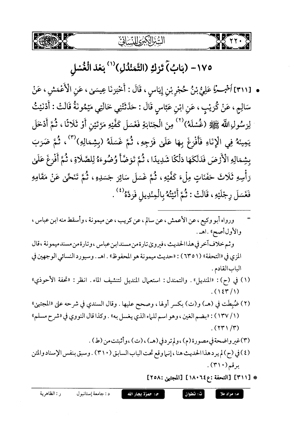 311- أَخبَرنا عَليُّ بنُ حُجْرِ بنِ إِيَاسٍ، قَالَ: أَخبَرنا عِيسَى، عَنِ الأَعْمَشِ، عَن سَالِمٍ، عَن كُرَيْبٍ، عَنِ ابنِ عَبَّاسٍ، قَالَ: حَدَّثَتْنِي خَالَتِي مَيْمُونَةُ، قَالَتْ: أَدْنَيْتُ لِرَسُولِ اللهِ صَلى الله عَليه وسَلم غُسْلَهُ مِنَ الجَنَابَةِ فَغَسَلَ كَفَّيْهِ مَرَّتَيْنِ أَوْ ثَلاثًا، ثُمَّ أَدْخَلَ يَمِينَهُ فِي الإِنَاءِ فَأَفْرَغَ بِهَا عَلَى فَرْجِهِ، ثُمَّ غَسَلَهُ بِشِمَالِهِ، ثُمَّ ضَرَبَ بِشِمَالِهِ الأَرْضَ فَدَلَكَهَا دَلْكًا شَدِيدًا، ثُمَّ تَوَضَّأَ وُضُوءَهُ لِلصَّلاةِ، ثُمَّ أَفْرَغَ عَلَى رَأْسِهِ ثَلاثَ حَفْنَاتٍ مِلْءَ كَفَّيْهِ، ثُمَّ غَسَلَ سَائِرَ جَسَدِهِ، ثُمَّ تَنَحَّى عَن مَقَامِهِ فَغَسَلَ رِجْلَيْهِ، قَالَتْ: ثُمَّ أَتَيْتُهُ بِالمِنْدِيلِ فَرَدَّهُ.
