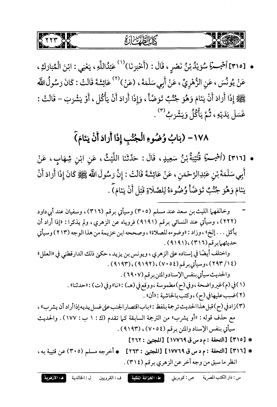 316- أَخبَرَنا قُتَيْبَةُ بنُ سَعِيدٍ، قال: حَدثنا اللَّيْثُ، عَنِ ابنِ شِهَابٍ، عَن أَبي سَلَمَةَ بنِ عَبدِ الرَّحمَنِ، عَن عَائِشَةَ قَالَتْ: إِنَّ رَسُولَ اللهِ صَلى الله عَليهِ وسَلم كَانَ إِذَا أَرَادَ أَنْ يَنَامَ وَهُوَ جُنُبٌ تَوَضَّأَ وُضُوءَهُ لِلصَّلاةِ قَبْلَ أَنْ يَنَامَ (1).