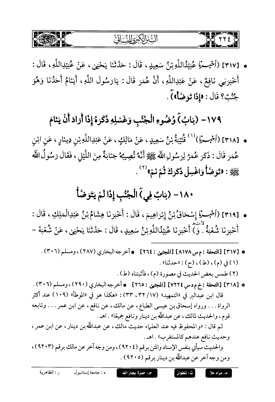 317- أَخبَرَنا عُبَيدُ اللهِ بنُ سَعِيدٍ، قال: حَدثنا يَحيَى، عَن عُبَيدِ اللهِ، قَالَ: أَخبَرني نَافِعٌ، عَن عَبد اللهِ بن عُمَرَ، أَنَّ عُمَرَ قَالَ: يَا رَسُولَ اللهِ، أَيَنَامُ أَحَدُنَا وَهُوَ جُنُبٌ؟ قَالَ: إِذَا تَوَضَّأَ (1).