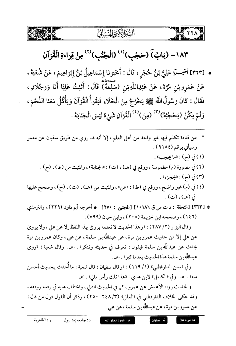 323- أَخبَرنا عَليُّ بنُ حُجْرٍ، قَالَ: أَخبَرنا إِسمَاعِيلُ بنُ إِبرَاهِيمَ، عَن شُعبَةَ، عَن عَمْرِو بنِ مُرَّةَ، عَن عَبدِ اللهِ بنِ سَلِمَةَ، قَالَ: أَتَيْتُ عَليًّا أَنَا وَرَجُلانِ، فَقَالَ: كَانَ رَسُولُ اللهِ صَلى الله عَليه وسَلم يَخْرُجُ مِنَ الخَلاءِ فَيَقْرَأُ القُرْآنَ، وَيَأْكُلُ مَعَنَا اللَّحْمُ، وَلَمْ يَكُنْ يَحْجُبُهُ مِنَ القُرْآنِ شَيْءٌ، لَيْسَ الجَنَابَةَ.