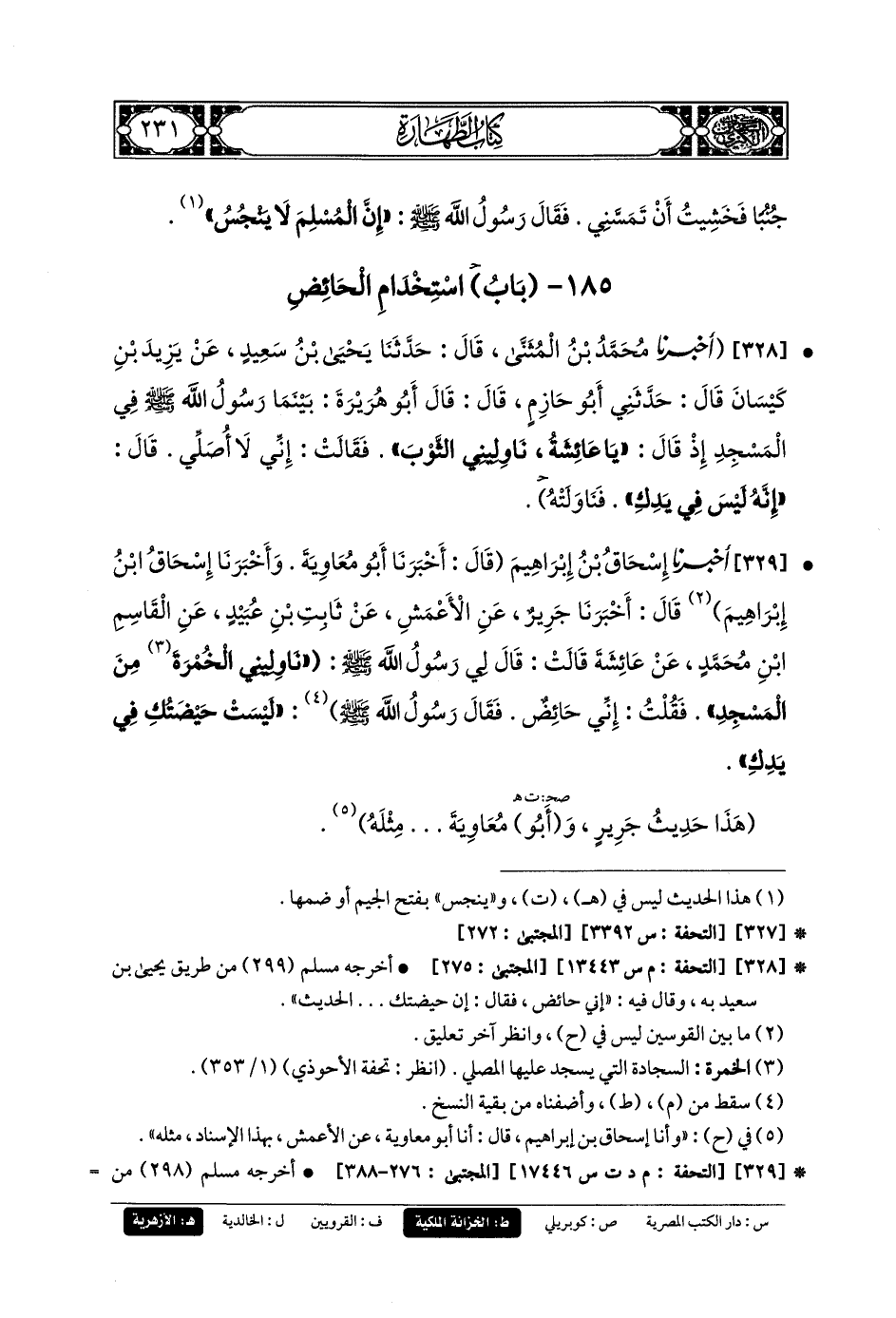 328-أخبَرَنا مُحَمد بنُ المُثَنَّى، قال: حَدثنا يَحيَى بنُ سَعِيدٍ، عَن يَزِيدَ بْنَ كَيْسَانَ، قَالَ: حَدَّثني أَبو حَازِمٍ قَالَ: قَالَ أَبو هُرَيرَةَ: بَيْنَمَا رَسُولُ اللهِ صَلى الله عَليهِ وسَلم فِي المَسْجِدِ إِذْ قَالَ: يَا عَائِشَةُ نَاوِلِينِي الثَّوْبَ، فَقَالَتْ: إِنِّي لا أُصَلِّي، قَالَ: إِنَّهُ لَيْسَ فِي يَدِكِ فَنَاوَلَتْهُ (1).