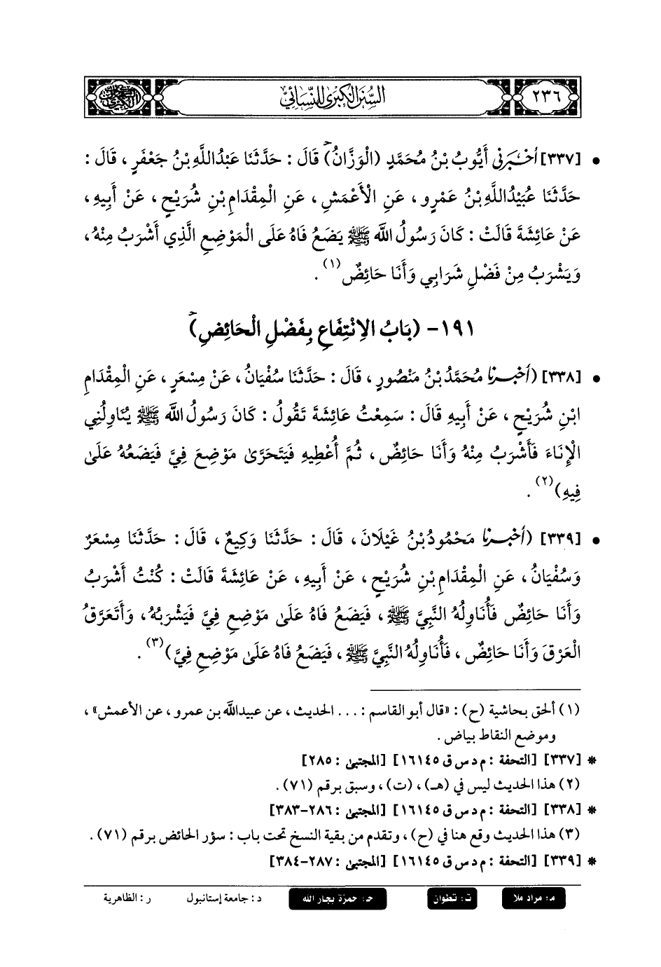 338- أَخبَرنا مُحَمدُ بنُ مَنصُورٍ، قَالَ: حَدثنا سُفيانُ، عَن مِسْعَرٍ، عَنِ المِقْدَامِ بنِ شُرَيْحٍ، عَن أَبيهِ، قَالَ: سَمِعْتُ عَائِشَةَ، تَقُولُ: كَانَ رَسُولُ اللهِ صَلى الله عَليه وسَلم يُنَاوِلُنِي الإِنَاءَ فَأَشْرَبُ مِنْهُ، وَأَنَا حَائِضٌ، ثُمَّ أُعْطِيَهُ فَيَتَحَرَّى مَوْضِعَ فِيَّ فَيَضَعُهُ عَلَى فِيهِ.