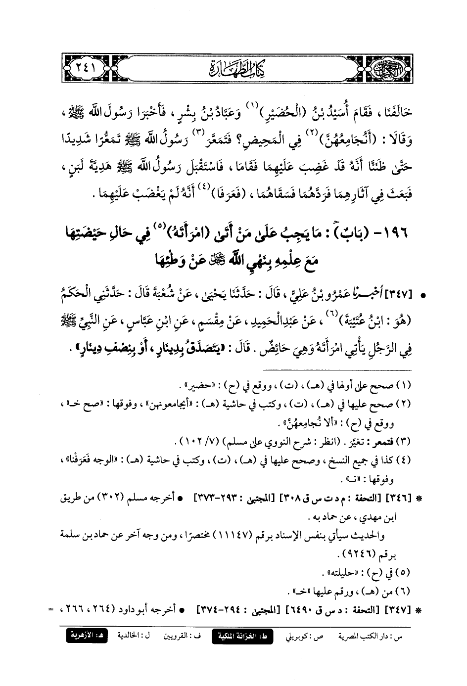 347- أَخبَرنا عَمرُو بنُ عَليٍّ، قَالَ: حَدثنا يَحيَى، عَن شُعبَةَ، قَالَ: حَدَّثني الحَكَمُ هُوَ ابنُ عُتَيْبَةَ، عَن عَبدِ الحَمِيدِ، عَن مِقْسَمٍ، عَنِ ابنِ عَبَّاسٍ، عَنِ النَّبيِّ صَلى الله عَليه وسَلم فِي الرَّجُلِ يَأْتِي امْرَأَتَهُ وَهِيَ حَائِضٌ، قَالَ: يَتَصَدَّقُ بِدِينَارٍ، أَوْ بِنِصْفِ دِينَارٍ.
