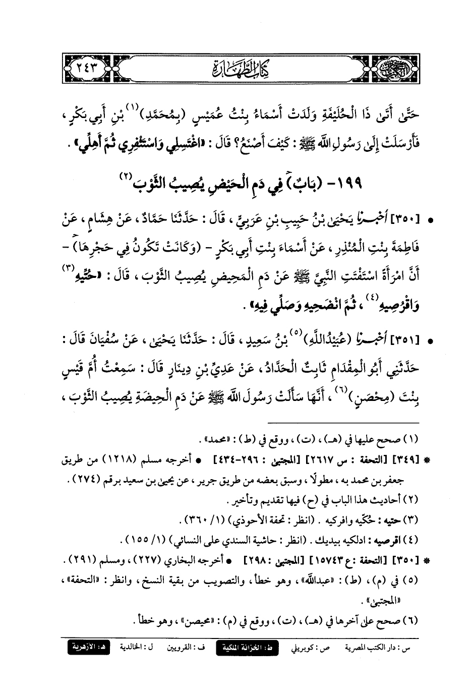 350- أَخبَرنا يَحيَى بنُ حَبِيبِ بنِ عَرَبِيٍّ، قَالَ: حَدثنا حَمَّادٌ، عَن هِشَامٍ، عَن فَاطِمَةَ بِنْتَ المُنْذِرِ، عَن أَسْمَاءَ بِنْتِ أَبي بَكْرٍ، وَكَانَتْ تَكُونُ فِي حَجْرِهَا أَنَّ امْرَأَةً اسْتَفْتَتِ النَّبيَّ صَلى الله عَليه وسَلم عَن دَمِ المَحِيضِ يُصِيبُ الثَّوْبَ؟ قَالَ: حُتِّيهِ وَاقْرُصِيهِ، ثُمَّ انْضَحِيهِ وَصَلِّي فِيهِ.