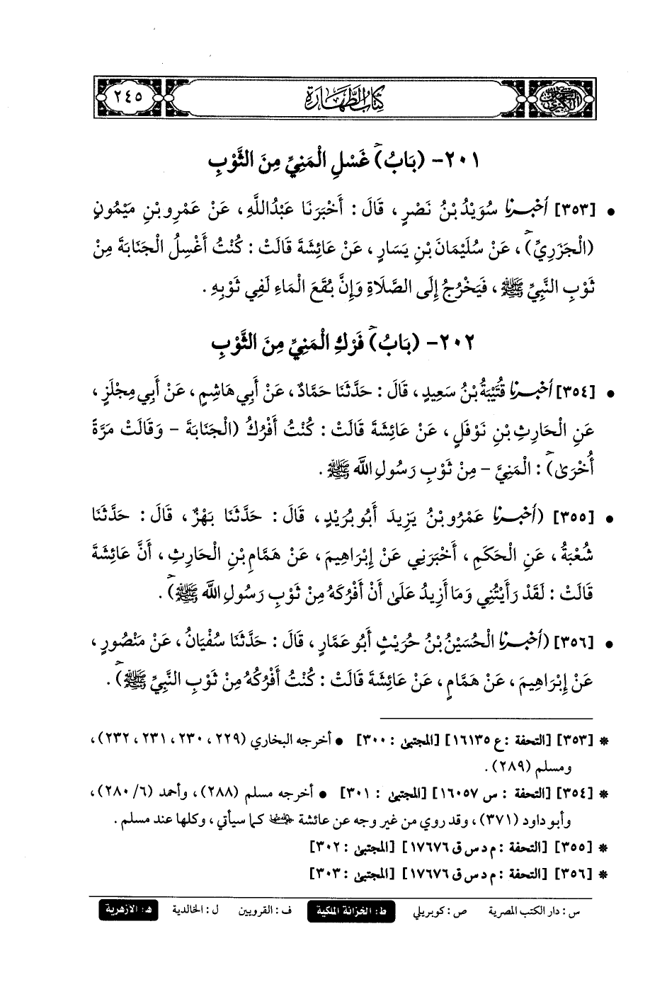 354- أَخبَرنا قُتَيبَةُ بنُ سَعِيدٍ، قَالَ: حَدثنا حَمَّادٌ، عَن أَبي هَاشِمٍ، عَن أَبي مِجْلَزٍ، عَنِ الحَارِثِ بنِ نَوْفَلٍ، عَن عَائِشَةَ، قَالَتْ: كُنْتُ أَفْرُكُ الجَنَابَةَ، وَقَالَتْ مَرَّةً أُخْرَى: المَنِيَّ مِنْ ثَوْبِ رَسُولِ اللهِ صَلى الله عَليه وسَلم.