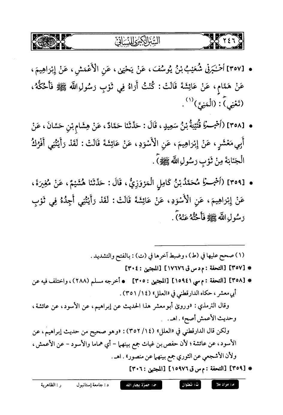 359- أَخبَرَنا مُحَمد بنُ كَامِلٍ المَرْوَزِيُّ، قال: حَدثنا هُشَيْمٌ، عَن مُغِيرَةَ، عَن إِبرَاهِيمَ، عَنِ الأَسْوَدِ، عَن عَائِشَةَ قَالَتْ: لَقَدْ رَأَيْتُنِي أَجِدُهُ فِي ثَوْبِ رَسُولِ اللهِ صَلى الله عَليهِ وسَلم فَأَحُتُّهُ عَنهُ (1).