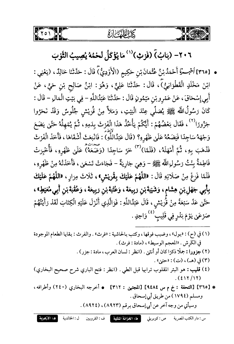 365 - أَخبَرنا أَحْمَدُ بنُ عُثْمَانَ بنِ حَكِيمٍ الأَوْدِيُّ، قَالَ: حَدثنا خَالِدٌ يَعْنِي ابنَ مَخْلَدٍ القَطْوَانِيُّ، قَالَ: حَدثنا عَليٌّ، وَهُوَ ابنُ صَالِحِ بنِ حَيٍّ، عَن أَبي إِسحَاقَ، عَن عَمْرِو بنِ مَيْمُونٍ، قَالَ: حَدثنا عَبدُ اللهِ فِي بَيْتِ المَالِ، قَالَ: كَانَ رَسُولُ اللهِ صَلى الله عَليه وسَلم يُصَلِّي عِنْدَ البَيْتِ، وَمَلأٌ مِنْ قُرَيْشٍ جُلُوسٌ وَقَدْ نَحَرُوا جَزُورًا، فَقَالَ بَعْضُهُمْ: أَيُّكُمْ يَأْخُذُ هَذَا الفَرْثَ بِدَمِهِ، ثُمَّ يُمْهِلُهُ حَتَّى يَضَعَ وَجْهَهُ سَاجِدًا فَيَضَعُهُ عَلَى ظَهْرِهِ، قَالَ عَبدُ اللهِ: فَانْبَعَثَ أَشْقَاهَا فَأَخَذَ الفَرْثَ فَذَهَبَ بِهِ، ثُمَّ أَمْهَلَهُ حَتَّى خَرَّ سَاجِدًا وَضَعَهُ عَلَى ظَهْرِهِ، فَأُخْبِرَتْ فَاطِمَةُ بِنْتُ رَسُولِ اللهِ صَلى الله عَليه وسَلم وَهِيَ جَارِيَةٌ فَجَاءَتْ تَسْعَى فَأَخَذَتْهُ مِنْ ظَهْرِهِ، فَلَمَّا فَرَغَ مِنْ صَلاتِهِ، قَالَ: اللهُمَّ عَلَيْكَ بِقُرَيْشٍ ثَلاثَ مِرَارٍ، اللهُمَّ عَلَيْكَ بِأَبي جَهْلِ بنِ هِشَامٍ، وَشَيْبَةَ بنِ رَبِيعَةَ، وَعُتْبَةَ بنِ رَبِيعَةَ، وَعُقْبَةَ بنِ أَبي مُعَيْطٍ، حَتَّى عَدَّ سَبْعَةً مِنْ قُرَيْشٍ، قَالَ عَبدُ اللهِ: فَوَالَّذِي أَنْزَلَ عَلَيْهِ الكِتَابَ لَقَدْ رَأَيْتُهُمْ صَرْعَى يَوْمَ بَدْرٍ فِي قَلِيبٍ وَاحِدٍ.