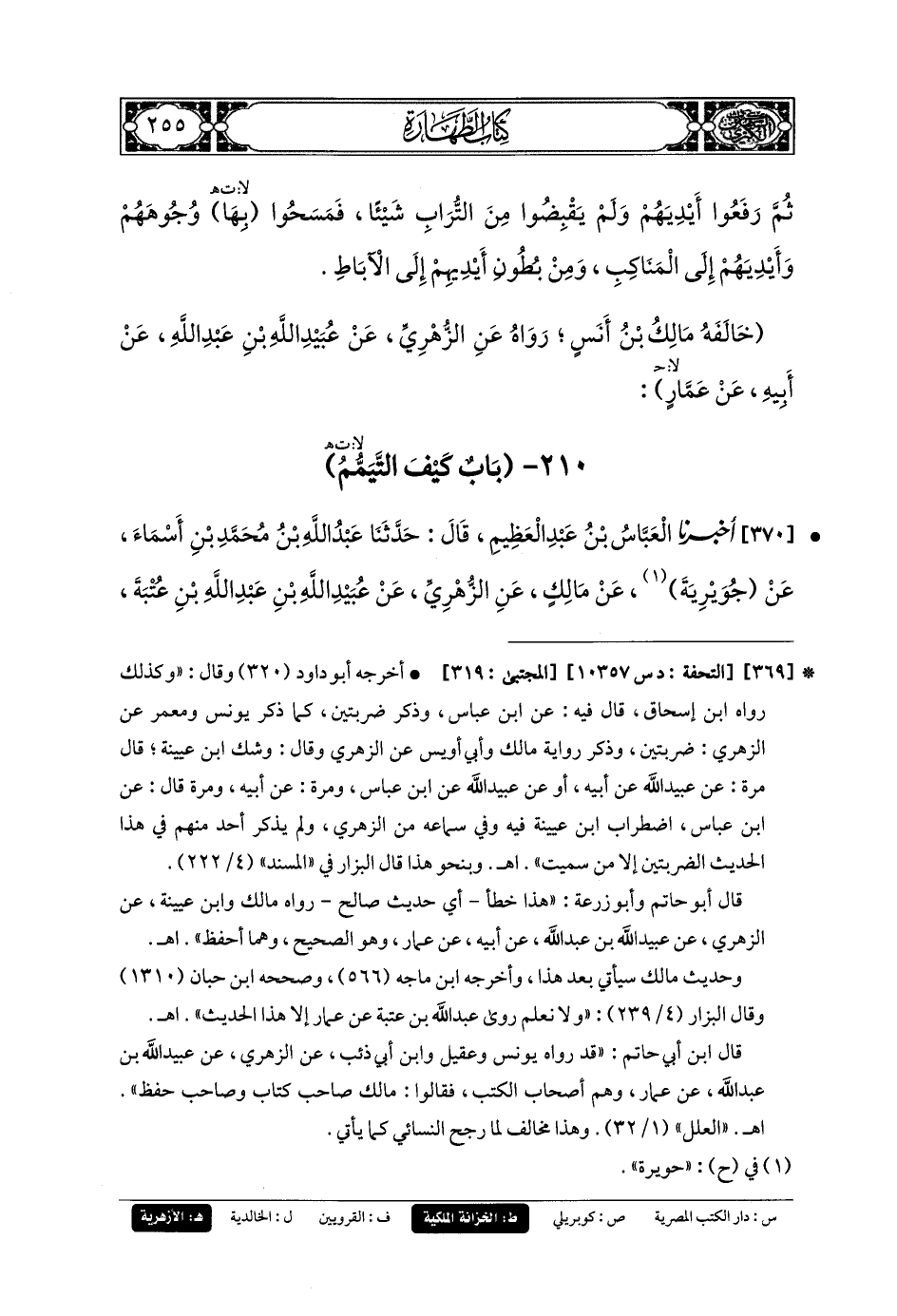 370- أَخبَرنا العَبَّاسُ بنُ عَبدِ العَظِيمِ، قَالَ: حَدثنا عَبدُ اللهِ بنُ مُحَمدِ بنِ أَسْمَاءَ، عَن جُوَيْرِيَةَ، عَن مَالِكٍ، عَنِ الزُّهْرِيِّ، عَن عُبَيدِ اللهِ بنِ عَبدِ اللهِ بنِ عُتْبَةَ، أَنَّهُ أَخبَرَهُ عَن أَبيهِ، عَن عَمَّارِ بنِ يَاسِرٍ، قَالَ: تَيَمَّمْنَا مَعَ رَسُولِ اللهِ صَلى الله عَليه وسَلم بِالتُّرَابِ، فَمَسَحْنَا بِوُجُوهِنَا وَأَيْدِينَا إِلَى المَنَاكِبِ.