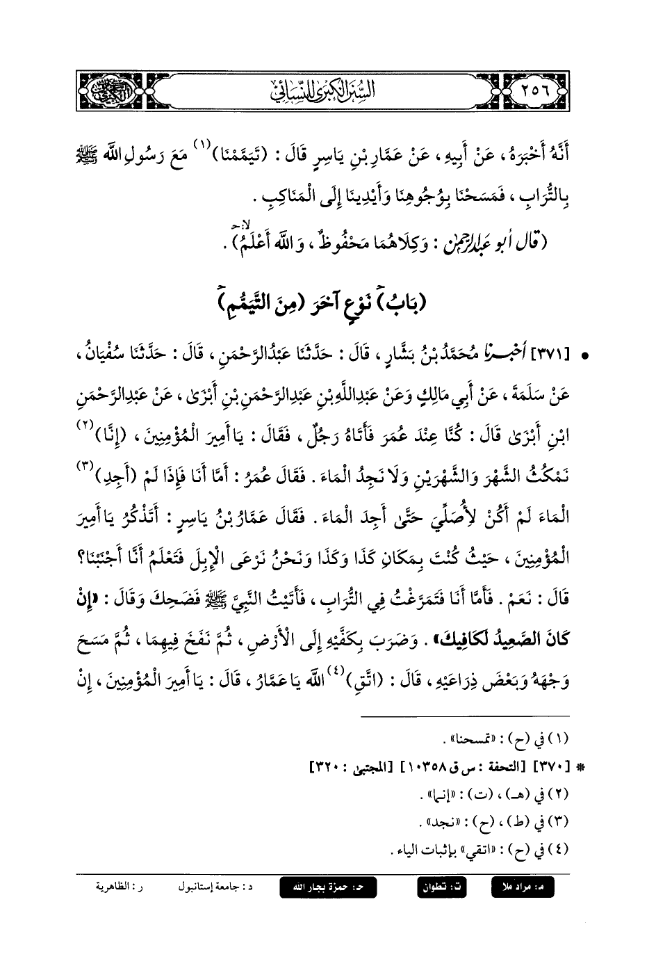 371- أَخبَرنا مُحَمدُ بنُ بَشَّارٍ، قَالَ: حَدثنا عَبدُ الرَّحمَنِ، قَالَ: حَدثنا سُفيانُ، عَن سَلَمَةَ، عَن أَبي مَالِكٍ، وَعَن عَبدِ اللهِ بنِ عَبدِ الرَّحمَنِ بنِ أَبْزَى، عَن عَبدِ الرَّحمَنِ بنِ أَبْزَى، قَالَ: كُنَّا عِنْدَ عُمَرَ فَأَتَاهُ رَجُلٌ، فَقَالَ: يَا أَمِيرَ المُؤْمِنِينَ، إِنَّا نَمْكُثُ الشَّهْرَ وَالشَّهْرَيْنِ وَلا نَجْدُ المَاءَ، فَقَالَ عُمَرُ: أَمَّا أَنَا فَإِذَا لَمْ أَجِدِ المَاءَ لَمْ أَكُنْ لأُصَلِّي حَتَّى أَجِدَ المَاءَ، فَقَالَ عَمَّارُ بنُ يَاسِرٍ: أَتَذْكُرُ يَا أَمِيرَ المُؤْمِنِينَ حَيْثُ كُنْتَ بِمَكَانِ كَذَا وَكَذَا، وَنَحْنُ نَرْعَى الإِبِلَ فَتَعْلَمُ أَنَّا أَجْنَبْنَا، قَالَ: نَعَمْ، فَأَمَّا أَنَا فَتَمَرَّغْتُ فِي التُّرَابِ فَأَتَيْتُ النَّبيَّ صَلى الله عَليه وسَلم فَضَحِكَ وَقَالَ: إِنْ كَانَ الصَّعِيدُ لَكَافِيكَ، وَضَرَبَ بِكَفَّيْهِ إِلَى الأَرْضِ، ثُمَّ نَفَخَ فِيهِمَا، ثُمَّ مَسَحَ وَجْهَهُ وَبَعْضَ ذِرَاعَيْهِ. قَالَ: اتَّقِ اللهَ يَا عَمَّارُ، قَالَ: يَا أَمِيرَ المُؤْمِنِينَ إِنْ شِئْتَ لَمْ أَذْكُرْهُ، قَالَ: لا وَلَكِنْ نُوَلِّيكَ مِنْ ذَلِكَ مَا تَوَلَّيْتَ.
