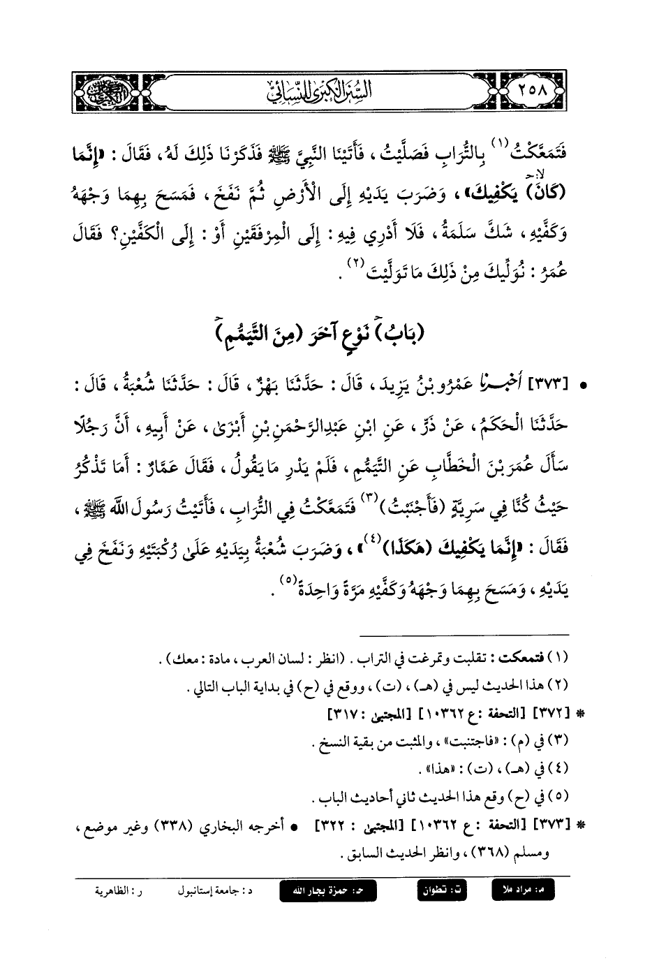 373- أَخبَرنا عَمرُو بنُ يَزِيدَ، قَالَ: حَدثنا بَهْزٌ، قَالَ: حَدثنا شُعبَةُ، قَالَ: حَدثنا الحَكَمُ، عَن ذَرٍّ، عَنِ ابنِ عَبدِ الرَّحمَنِ بنِ أَبْزَى، عَن أَبيهِ، أَنَّ رَجُلاً سَأَلَ عُمَرَ بْنَ الخَطَّابِ عَنِ التَّيَمُّمِ؟ فَلَمْ يَدْرِ مَا يَقُولُ، فَقَالَ عَمَّارٌ: أَمَا تَذْكُرُ حَيْثُ كُنَّا فِي سَرِيَّةٍ فَأَجْنَبْتُ فَتَمَعَّكْتُ فِي التُّرَابِ، فَأَتَيْتُ رَسُولَ اللهِ صَلى الله عَليه وسَلم، فَقَالَ: إِنَّمَا يَكْفِيكَ هَكَذَا وَضَرَبَ شُعبَةُ بِيَدَيْهِ عَلَى رُكْبَتَيْهِ وَنَفَخَ فِي يَدَيْهِ وَمَسَحَ بِهِمَا وَجْهَهُ وَكَفَّيْهِ مَرَّةً وَاحِدَةً.