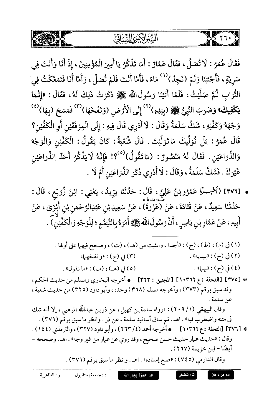 376- أَخبَرنا عَمرُو بنُ عَليٍّ، قَالَ: حَدثنا يَزِيدُ، يَعْنِي ابنَ زُرَيْعٍ، قَالَ: حَدثنا سَعِيدٌ، عَن قَتَادَةَ، عَن عَزْرَةَ، عَن سَعِيدِ بنِ عَبدِ الرَّحمَنِ بنِ أَبْزَى، عَن أَبيهِ، عَن عَمَّارِ بنِ يَاسِرٍ، أَنَّ رَسُولَ اللهِ صَلى الله عَليه وسَلم: أَمَرَهُ بِالتَّيَمُّمِ لِلْوَجْهِ وَالكَفَّيْنِ.