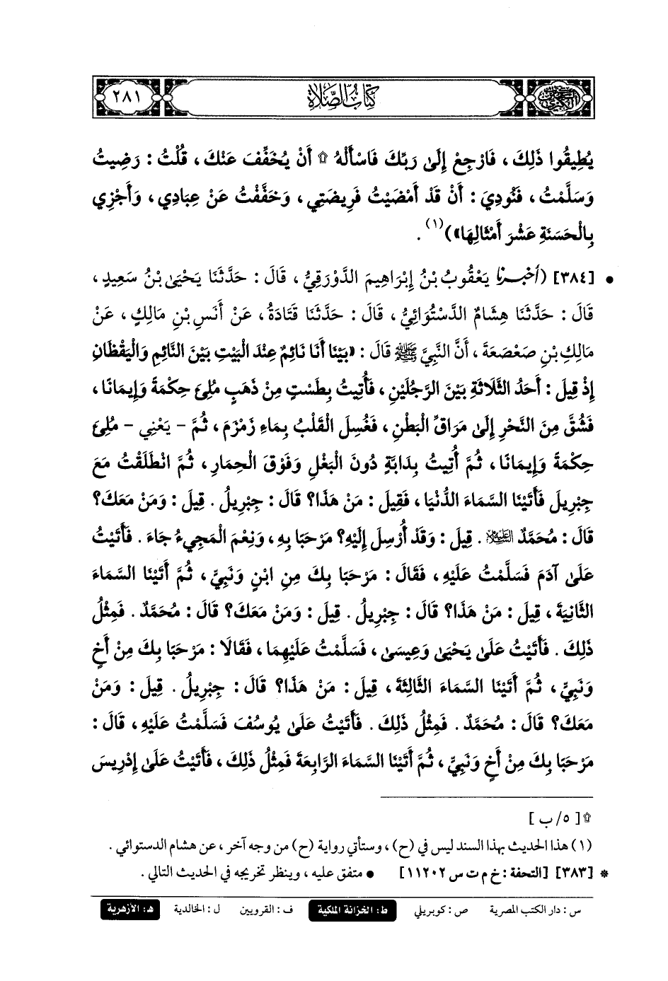 384- أَخبَرَنا يَعقُوبُ بنُ إِبرَاهِيمَ الدَّوْرَقِيُّ، قال: حَدثنا يَحيَى بنُ سَعِيدٍ، قال: حَدثنا هِشَامٌ الدَّسْتُوَائِيُّ، قال: حَدثنا قَتَادَةُ، عَن أَنَسِ بنِ مَالِكٍ، عَن مَالِكِ بنِ صَعْصَعَةَ، أَنَّ النَّبيَّ صَلى الله عَليهِ وسَلم قَالَ: بَيْنَا أَنَا نَائِمٌ عِنْدَ البَيْتِ بَيْنَ النَّائِمِ وَاليَقْظَانِ إِذْ قِيلَ أَحَدُ الثَّلاثَةِ بَيْنَ الرَّجُلَيْنِ، فَأُتِيتُ بِطَسْتٍ مِنْ ذَهَبٍ مُلِئَ حِكْمَةً وَإِيمَانًا، فَشُقَّ مِنِ النَّحْرِ إِلَى مَرَاقِّ البَطْنِ، فَغُسَلَ القَلْبَ بِمَاءِ زَمْزَمَ، ثُمَّ يعني مُلِئَ حِكْمَةً وَإِيمَانًا، ثُمَّ أُتِيتُ بِدَابَّةٍ دُونَ البَغْلِ وَفَوْقَ الحِمَارِ، ثُمَّ انْطَلَقْتُ مَعَ جِبْرِيلَ فَأَتَيْنَا السَّمَاءَ الدُّنْيَا فَقِيلَ: مَنْ هَذَا؟ قَالَ: جِبْرِيلُ، قِيلَ: وَمَنْ مَعَكَ؟ قَالَ: مُحَمدٌ عَلَيْهِ السَّلامُ، قِيلَ: وَقَدْ أُرْسِلَ إِلَيْهِ؟ مَرْحَبًا بِهِ وَنِعْمَ المَجِيءُ جَاءَ، فَأَتَيْتُ عَلَى آدَمَ عَلَيْهِ السَّلامُ فَسَلَّمْتُ عَلَيْهِ، فَقَالَ: مَرْحَبًا بِكَ مِنَ ابنٍ وَنَبِيٍّ، ثُمَّ أَتَيْنَا السَّمَاءَ الثَّانِيَةَ، قِيلَ: مَنْ هَذَا؟ قَالَ: جِبْرِيلُ، قِيلَ: وَمَنْ مَعَكَ؟ قَالَ: مُحَمدٌ، فَمِثْلُ ذَلَكَ، فَأَتَيْتُ عَلَى يَحيَى وَعِيسَى فَسَلَّمْتُ عَلَيْهِمَا فَقَالا: مَرْحَبًا بِكَ مِنْ أَخٍ وَنَبِيٍّ، ثُمَّ أَتَيْنَا السَّمَاءَ الثَّالِثَةَ، قِيلَ: مَنْ هَذَا؟ قَالَ: جِبْرِيلُ، قِيلَ: وَمَنْ مَعَكَ؟ قَالَ: مُحَمدٌ، فَمِثْلُ ذَلِكَ، فَأَتَيْتُ عَلَى يُوسُفَ، فَسَلَّمْتُ عَلَيْهِ، قَالَ: مَرْحَبًا بِكَ مِنْ أَخٍ وَنَبِيٍّ، ثُمَّ أَتَيْنَا السَّمَاءَ الرَّابِعَةَ، فَمِثْلُ ذَلِكَ، فَأَتَيْتُ عَلَى إِدرِيسَ فَسَلَّمْتُ عَلَيْهِ، فَقَالَ: مَرْحَبًا بِكَ مِنْ أَخٍ وَنَبِيٍّ، ثُمَّ أَتَيْنَا السَّمَاءَ الخَامِسَةَ، فَمِثْلُ ذَلِكَ،