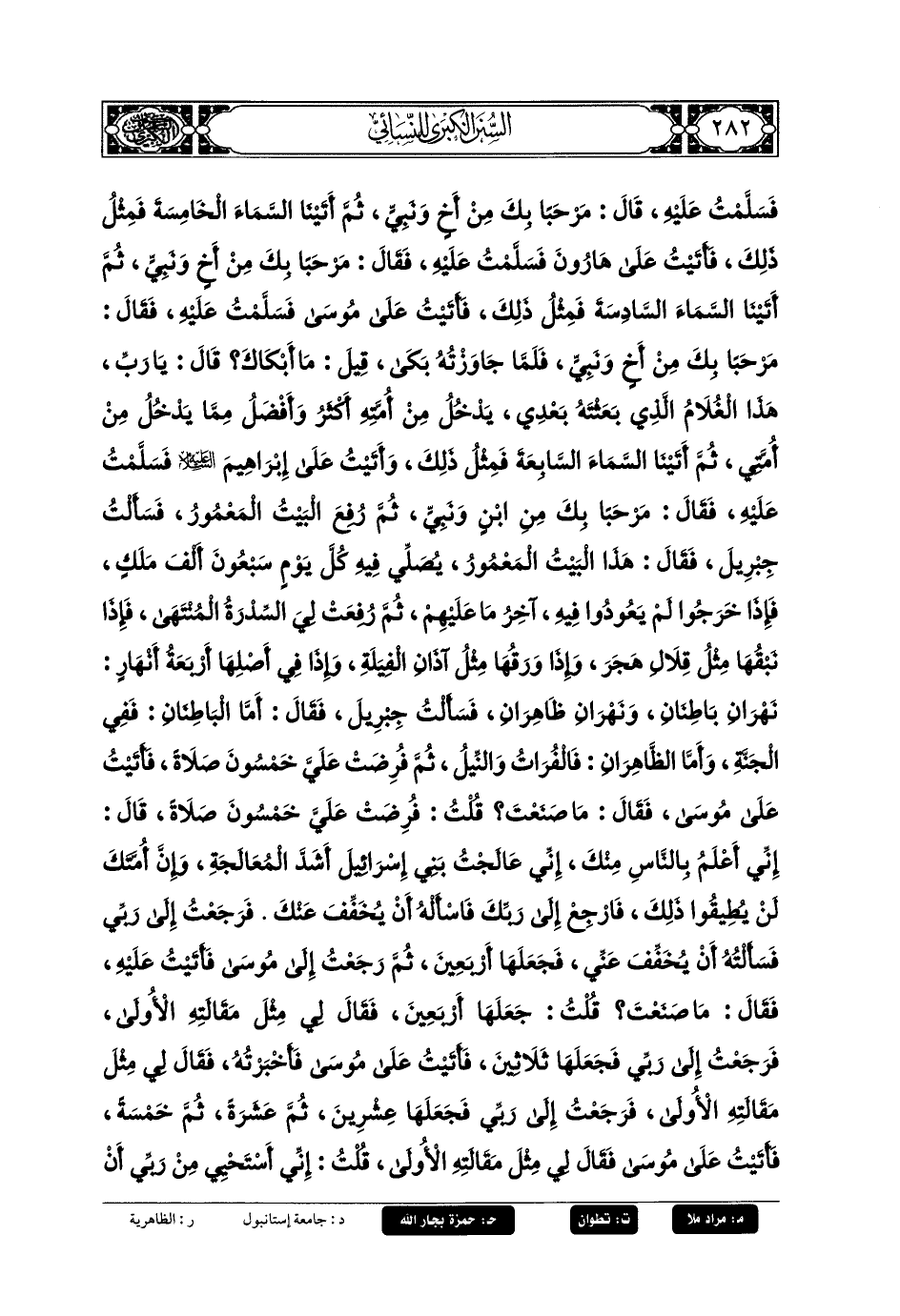 فَأَتَيْتُ عَلَى هَارُونَ عَلَيْهِ السَّلامُ، فَسَلَّمْتُ عَلَيْهِ، قَالَ: مَرْحَبًا بِكَ مِنْ أَخٍ وَنَبِيٍّ، ثُمَّ أَتَيْنَا السَّمَاءَ السَّادِسَةَ، فَمِثْلُ ذَلِكَ، ثُمَّ أَتَيْتُ عَلَى مُوسَى عَلَيْهِ السَّلامُ، فَسَلَّمْتُ عَلَيْهِ، فَقَالَ: مَرْحَبًا بِكَ مِنْ أَخٍ وَنَبِيٍّ، فَلَمَّا جَاوَزْتُهُ بَكَى، قِيلَ: مَا يُبْكِيكَ؟ قَالَ: يَا رَبِّ، هَذَا الغُلامُ الَّذِي بَعَثْتَهُ بَعْدِي، يَدْخُلُ مِنْ أُمَّتِهِ الجَنَّةَ أَكْثَرُ وَأَفْضَلُ مِمَّا يَدْخُلُ مِنْ أُمَّتِي، ثُمَّ أَتَيْنَا السَّمَاءَ السَّابِعَةَ، فَمِثْلُ ذَلِكَ، فَأَتَيْتُ عَلَى إِبرَاهِيمَ عَلَيْهِ السَّلامُ، فَسَلَّمْتُ عَلَيْهِ، فَقَالَ: مَرْحَبًا بِكَ مِنِ ابنٍ وَنَبِيٍّ، ثُمَّ رُفِعَ لِيَ البَيْتُ المَعْمُورُ، فَسَأَلْتُ جِبْرِيلَ فَقَالَ: هَذَا البَيْتُ المَعْمُورُ، يُصَلِّي فِيهِ كُلَّ يَوْمٍ سَبْعُونَ أَلْفَ مَلَكٍ، فَإِذَا خَرَجُوا مِنْهُ لَمْ يَعُودُوا فِيهِ آخِرَ مَا عَلَيْهِمْ، ثُمَّ رُفِعَتْ لِي سِدْرَةُ المُنْتَهَى، فَإِذَا نَبْقُهَا مِثْلُ قِلالِ هَجَرٍ، وَإِذَا وَرَقُهَا مِثْلُ آذَانِ الفِيَلَةِ، وَإِذَا فِي أَصْلِهَا أَرْبَعَةُ أَنْهَارٍ: نَهْرَانِ بَاطِنَانِ، وَنَهْرَانِ ظَاهِرَانِ، فَسَأَلْتُ جِبْرِيلَ فَقَالَ: أَمَّا البَاطِنَانِ فَفِي الجَنَّةِ، وَأَمَّا الظَّاهِرَانِ فَالفُرَاتُ وَالنِّيلُ .