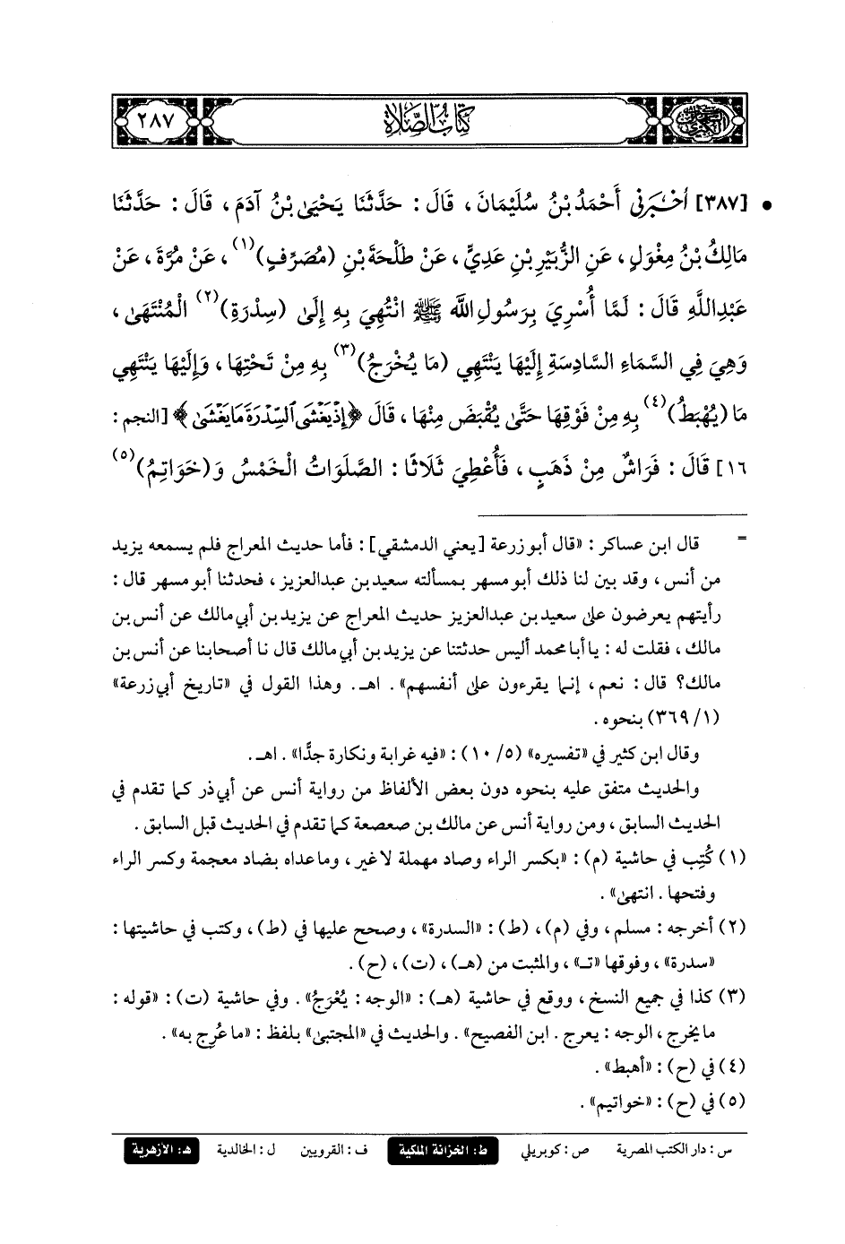 387- أَخبَرني أَحْمَدُ بنُ سُلَيمَانَ، قَالَ: حَدثنا يَحيَى بنُ آدَمَ، قَالَ: حَدثنا مَالِكُ بنُ مِغْوَلٍ، عَنِ الزُّبَيْرِ بنِ عَدِيٍّ، عَن طَلحَةَ بنِ مُصَرِّفٍ، عَن مُرَّةَ، عَن عَبدِ اللهِ، قَالَ: لَمَّا أُسْرِيَ بِرَسُولِ اللهِ صَلى الله عَليه وسَلم انْتُهِيَ بِهِ إِلَى سِدْرَةِ المُنْتَهَى، وَهِيَ فِي السَّمَاءِ السَّادِسَةِ، إِلَيْهَا يَنْتَهِي مَا يُخرَجُ بِهِ مَنْ تَحْتَهَا وَإِلَيْهَا يَنْتَهِي مَا يُهْبَطُ بِهِ مَنْ فَوْقَهَا حَتَّى يُقْبَضُ مِنْهَا، قَالَ: {إِذْ يَغْشَى السِّدْرَةَ مَا يَغْشَى} قَالَ: فِرَاشٌ مِنْ ذَهَبٍ، فَأُعْطِيَ ثَلاثًا: الصَّلَوَاتِ الخَمْسَ، وَخَوَاتِمُ سُورَةِ البَقَرَةِ، وَيُغْفَرُ لِمَنْ مَاتَ مِنْ أُمَّتِهِ لا يُشْرَكُ بِاللهِ شَيْئًا المُقْحِمَاتُ.