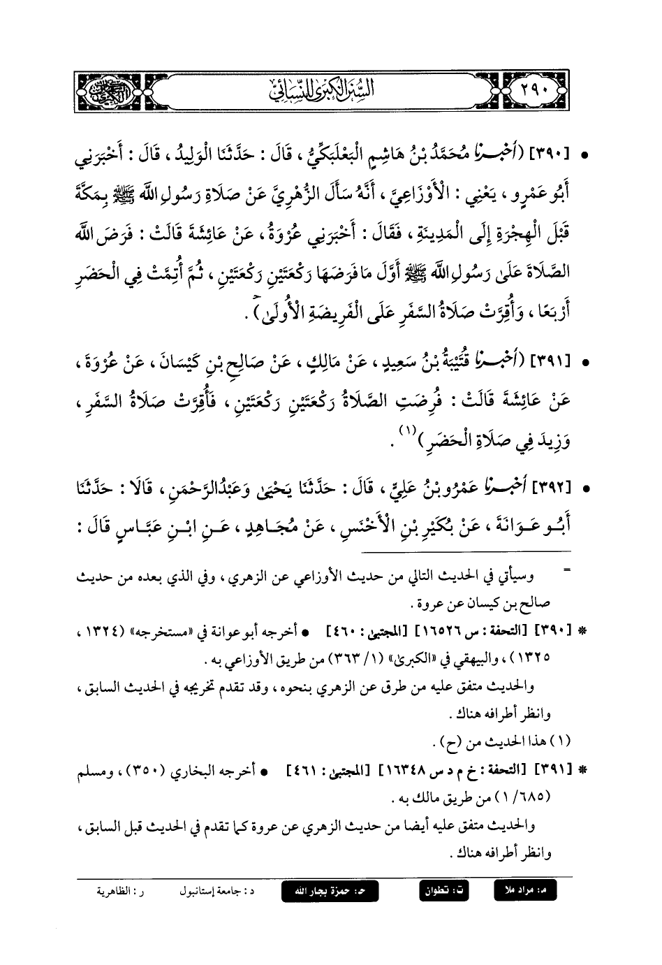 390- أَخبَرَنا مُحَمد بنُ هَاشِمٍ البَعْلَبَكِّيُّ، قَالَ: حَدثنا الوَلِيدُ، قَالَ: أَخبَرني أَبو عَمْرٍو يَعْنِي الأَوْزَاعِيَّ، أَنَّهُ سَأَلَ الزُّهْرِيَّ عَن صَلاةِ رَسُولِ اللهِ صَلى الله عَليهِ وسَلم بِمَكَّةَ قَبْلَ الهِجْرَةِ إِلَى المَدِينَةِ، قَالَ: أَخبَرني عُرْوَةُ، عَن عَائِشَةَ قَالَتْ: فَرَضَ اللهُ الصَّلاةَ عَلَى رَسُولِهِ صَلى الله عَليهِ وسَلم أَوَّلَ مَا فَرَضَهَا رَكْعَتَيْنِ رَكْعَتَيْنِ، ثُمَّ أُتِمَّتْ فِي الحَضَرِ أَرْبَعًا، وَأُقِرَّتْ صَلاةُ السَّفَرِ عَلَى الفَرِيضَةِ الأُولَى (1).