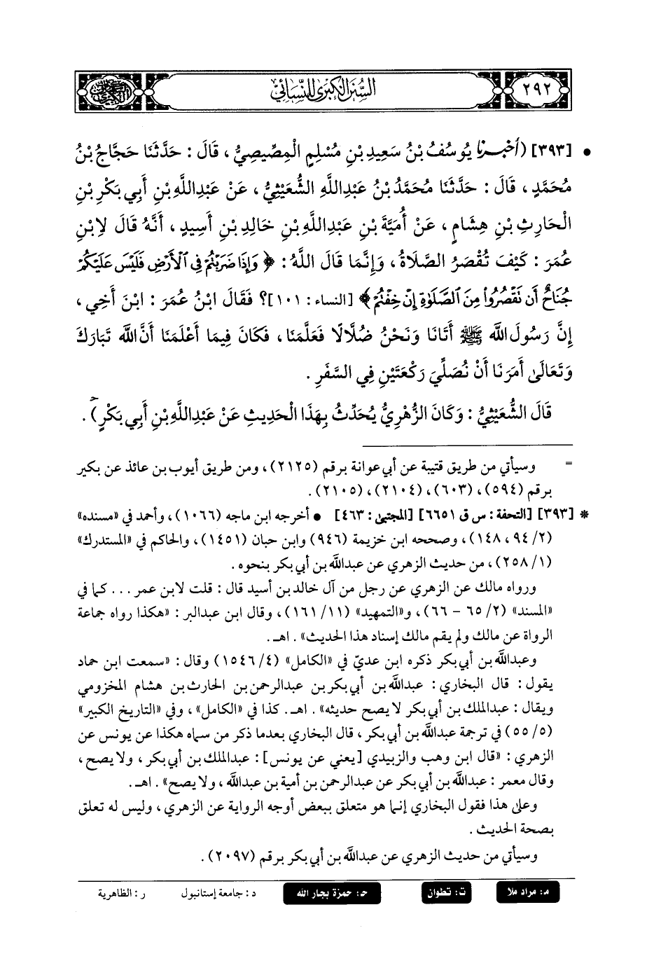 393- أَخبَرَنا يُوسُفُ بنُ سَعِيدِ بنِ مُسْلِمٍ المِصِّيصِيُّ، قال: حَدثنا حَجَّاجُ بنُ مُحَمدٍ، قال: حَدثنا مُحَمدُ بنُ عَبدِ اللهِ الشُّعَيْثِيُّ، عَن عَبد اللهِ بن أَبي بَكْرِ بنِ الحَارِثِ بنِ هِشَامٍ، عَن أُمَيَّةَ بنِ عَبدِ اللهِ بنِ خَالِدِ بنِ أَسِيدٍ ؛ أَنَّهُ قَالَ لاِبْنِ عُمَرَ: كَيْفَ تَقْصُرُ الصَّلاةَ؟ وَإِنَّمَا قَالَ اللهُ عَزَّ وَجَلَّ: {وَإِذَا ضَرَبْتُمْ فِي الأَرْضِ فَلَيْسَ عَلَيْكُمْ جُنَاحٌ أَنْ تَقْصُرُوا مِنَ الصَّلاةِ إِنْ خِفْتُمْ}، فَقَالَ ابنُ عُمَرَ: ابنَ أَخِي، إِنَّ رَسُولَ اللهِ صَلى الله عَليهِ وسَلم أَتَانَا وَنَحْنُ ضُلاَّلٌ فَعَلَّمَنَا، فَكَانَ فِيمَا أَعْلَمَنَا أَنَّ اللهَ تبارك وتعالى أَمَرَنَا أَنْ نُصَلِّيَ رَكْعَتَيْنِ فِي السَّفَرِ (1).