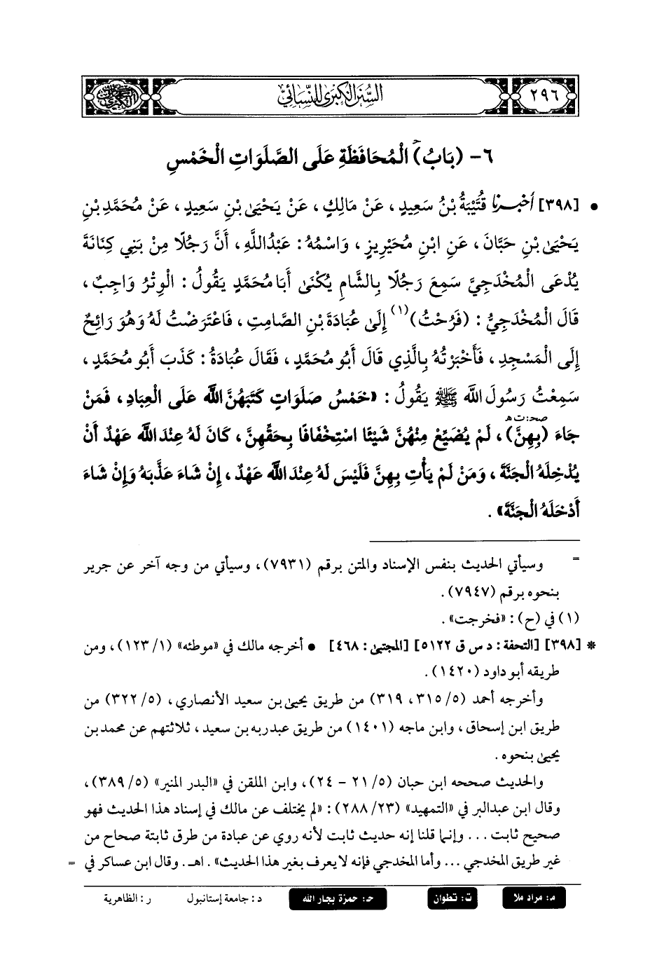 398- أَخبَرنا قُتَيبَةُ بنُ سَعِيدٍ، عَن مَالِكٍ، عَن يَحيَى بنِ سَعِيدٍ، عَن مُحَمدِ بنِ يَحيَى بنِ حَبَّانَ، عَنِ ابنِ مُحَيْرِيزٍ، وَاسْمُهُ عَبدُ اللهِ، أَنَّ رَجُلاً مِنْ بَنِي كِنَانَةَ يُدْعَى المُخْدَجِيَّ سَمِعَ رَجُلاً بِالشَّامِ يُكْنَى أَبَا مُحَمدٍ، يَقُولُ: الوِتْرُ وَاجِبٌ، قَالَ المُخْدَجِيُّ: فَرُحْتُ إِلَى عُبَادَةَ بنِ الصَّامِتِ فَاعْتَرَضْتُ لَهُ وَهُوَ رَائِحٌ إِلَى المَسْجِدِ، فَأَخبَرْتُهُ بِالَّذِي قَالَ أَبو مُحَمدٍ، فَقَالَ عُبَادَةُ: كَذَبَ أَبو مُحَمدٍ، سَمِعْتُ رَسُولَ اللهِ صَلى الله عَليه وسَلم، يَقُولُ: خَمْسُ صَلَوَاتٍ كَتَبَهُنَّ اللهُ عَلَى العِبَادِ، فَمَنْ جَاءَ بِهِنَّ لَمْ يُضَيِّعْ مِنْهُنَّ شَيْئًا اسْتِخْفَافًا بِحَقِّهِنَّ كَانَ لَهُ عِنْدَ اللهِ عَهْدٌ أَنْ يَدْخِلَهُ الجَنَّةَ، وَمَنْ لَمْ يَأْتِ بِهِنَّ فَلَيْسَ لَهُ عِنْدَ اللهِ عَهْدٌ إِنْ شَاءَ عَذَّبَهُ وَإِنْ شَاءَ أَدْخَلَهُ الجَنَّةَ.
