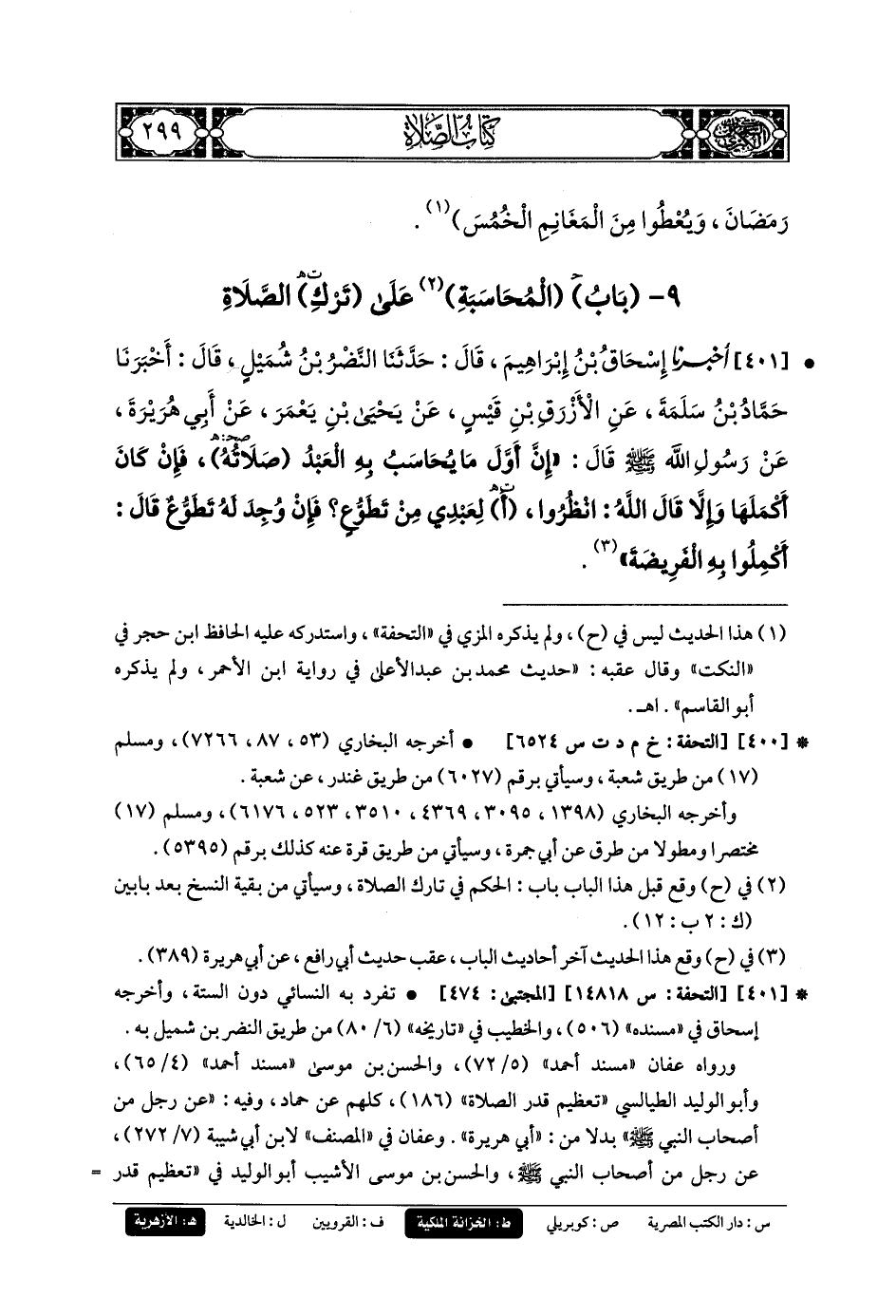 401- أَخبَرنا إِسحَاقُ بنُ إِبرَاهِيمَ، قَالَ: حَدثنا النَّضْرُ بنُ شُمَيْلٍ، قَالَ: أَخبَرنا حَمَّادُ بنُ سَلَمَةَ، عَنِ الأَزْرَقِ بنِ قَيسٍ، عَن يَحيَى بنِ يَعْمَرَ، عَن أَبي هُرَيرَةَ، عَن رَسُولِ اللهِ صَلى الله عَليه وسَلم، قَالَ: إِنَّ أَوَّلَ مَا يُحَاسَبُ بِهِ العَبدُ صَلاتُهُ، فَإِنْ كَانَ أَكْمَلَهَا وَإِلاَّ قَالَ اللهُ: انْظُرُوا أَلِعَبدِي مِنْ تَطَوُّعٍ، فَإِنْ وُجِدَ لَهُ تَطَوُّعٌ، قَالَ: أَكْمِلُوا بِهِ الفَرِيضَةَ.
