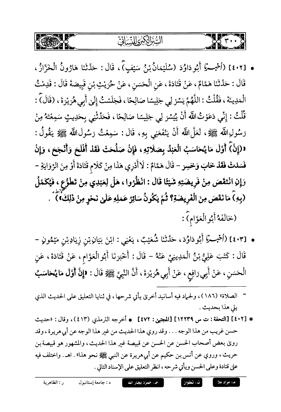 403- أَخبَرَنا أَبو دَاوُدَ، قال: حَدثنا شُعَيبٌ، يَعْنِي ابنَ بَيَانِ بنِ زِيَادِ بنِ مَيْمُونٍ، قَالَ: كَتَبَ عَليُّ بنُ المَدِينِيِّ عَنهُ، قَالَ: أَخبَرَنا أَبو العَوَّامِ، عَن قَتَادَةَ، عَنِ الحَسَنِ، عَن أَبي رَافِعٍ، عَن أَبي هُرَيرَةَ ؛ أَنَّ النَّبيَّ صَلى الله عَليهِ وسَلم قَالَ: إِنَّ أَوَّلَ مَا يُحَاسَبُ بِهِ العَبدُ يَوْمَ القِيَامَةِ صَلاتُهُ، فَإِنْ وُجِدَتْ تَامَّةً كُتِبَتْ تَامَّةً، وَإِنْ كَانَ انْتُقِصَ مِنْهَا شَيئًا، قَالَ: انْظُرُوا هَلْ تَجِدُوا لَهُ مِنْ تَطَوُّعٍ تُكْمِلُ لَهُ مَا ضَيَّعَ مِنْ فَرِيضَةٍ مِنْ تَطَوُّعِهِ، ثُمَّ سَائِرُ الأَعْمَالِ تَجْرِي عَلَى حَسَبِ ذَلِكَ (1).