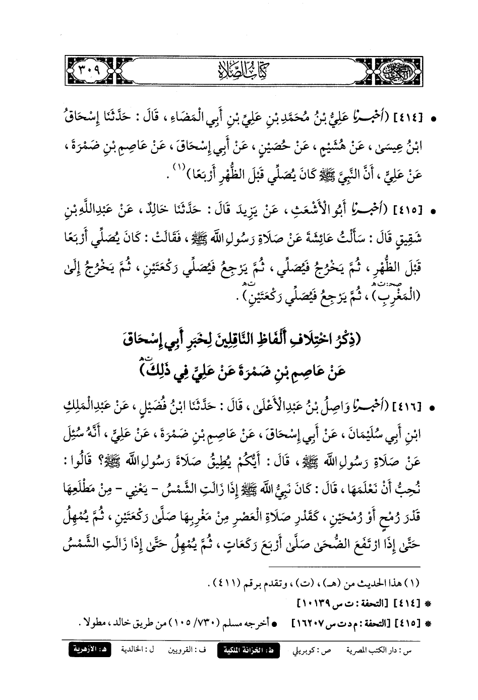 414- أَخبَرنا عَليُّ بنُ مُحَمدِ بنِ عَليِّ بنِ أَبي المَضَاءِ، قَالَ: حَدثنا إِسحَاقُ بنُ عِيسَى، عَن هُشَيْمٍ، عَن حُصَيْنٍ، عَن أَبي إِسحَاقَ، عَن عَاصِمِ بنِ ضَمْرَةَ، عَن عَليٍّ، أَنَّ النَّبيَّ صَلى الله عَليه وسَلم: كَانَ يُصَلِّي قَبْلَ الظُّهْرِ أَرْبَعًا.